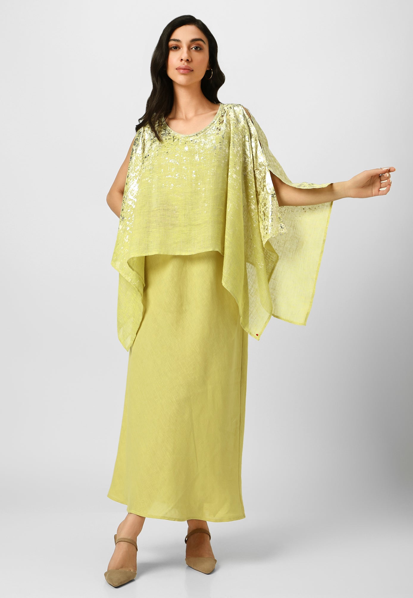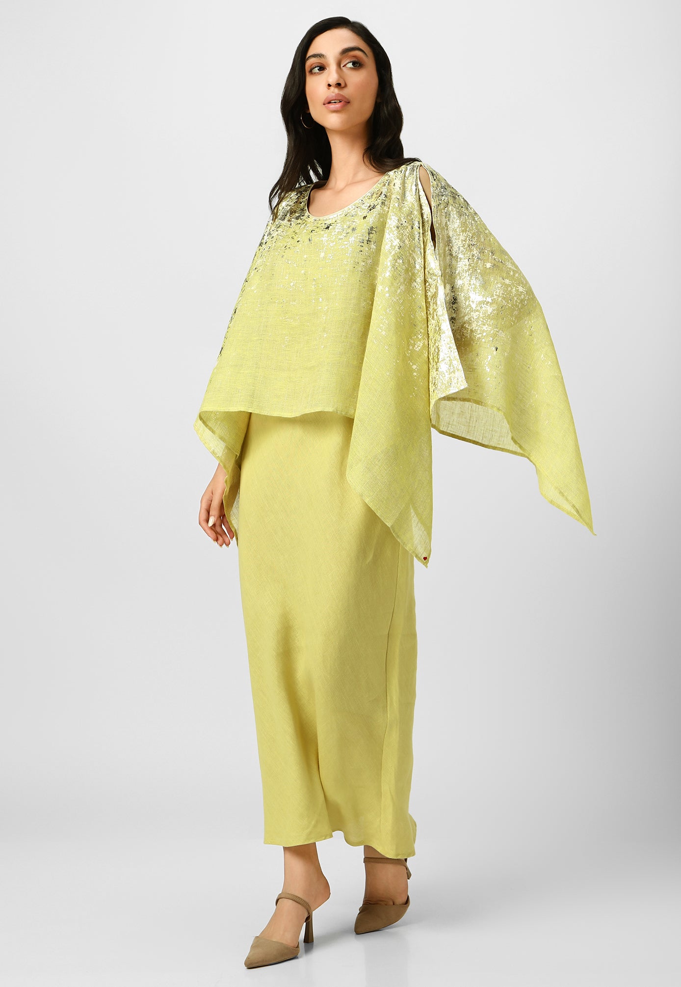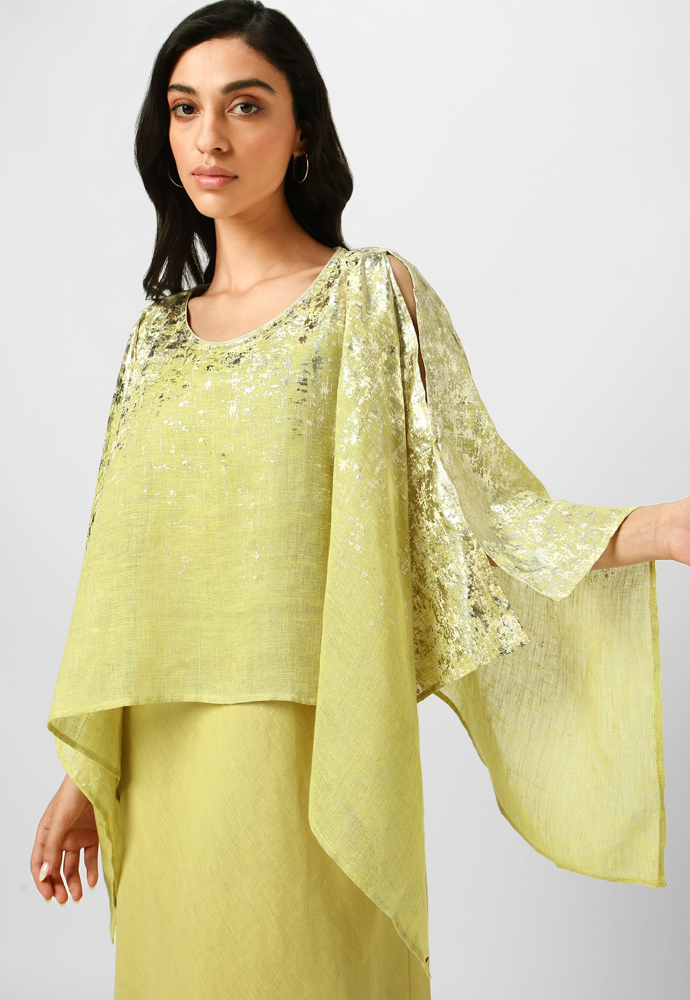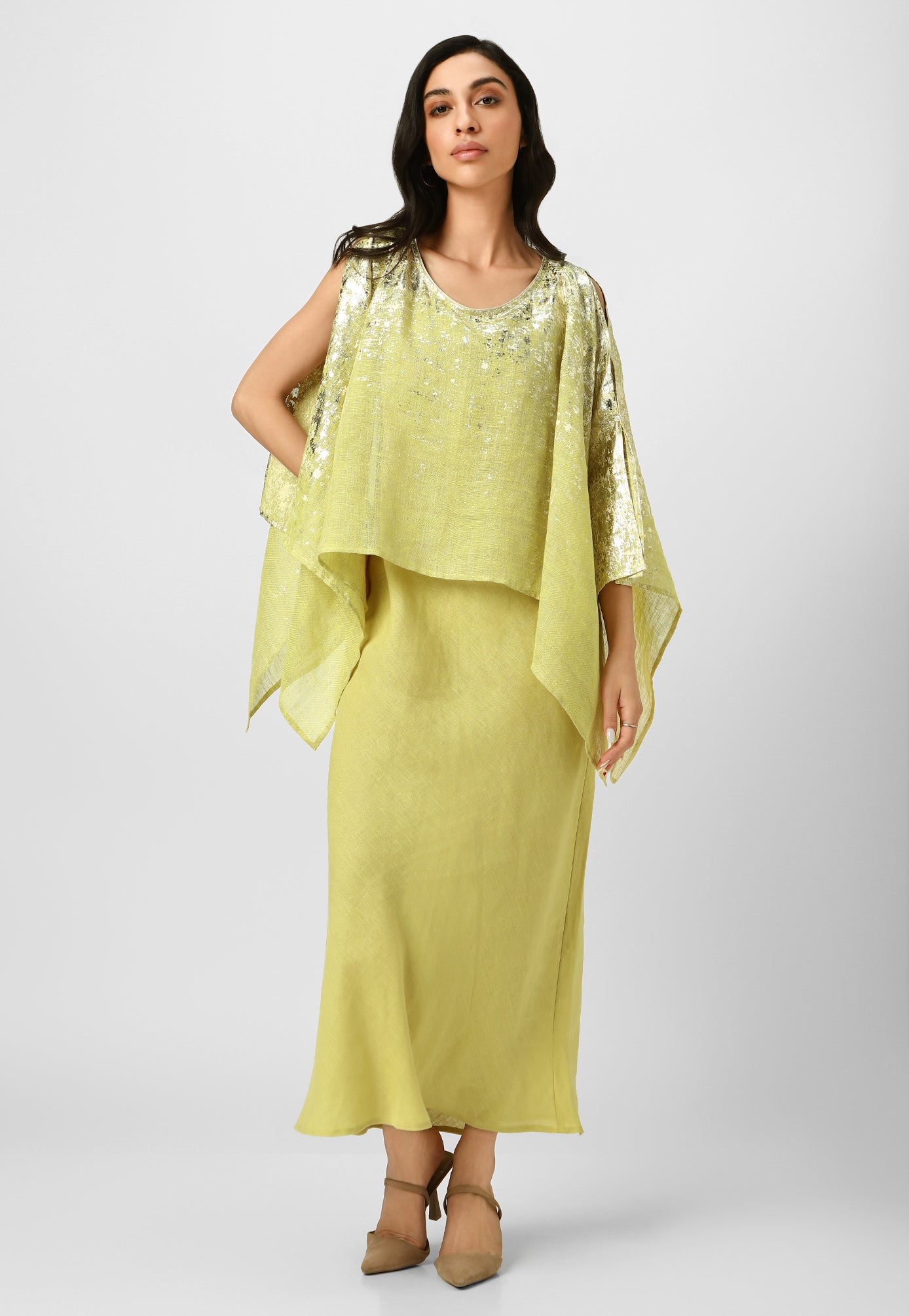 Step into paradise in a breezy work of art inspired by the rustic charm of Venetian walls. Crafted from the purest linen fabric in comfortable, angled silhouettes that beautifully curve on your body for your next getaway, this collection is masterfully shaded with captivating strokes and a touch of gold- using an amalgamation of foil and pigment- adding colour, depth and intrigue. Choose from a breathtaking combination of shades from neon-offwhite, natural-lagoon and lagoon-offwhite.