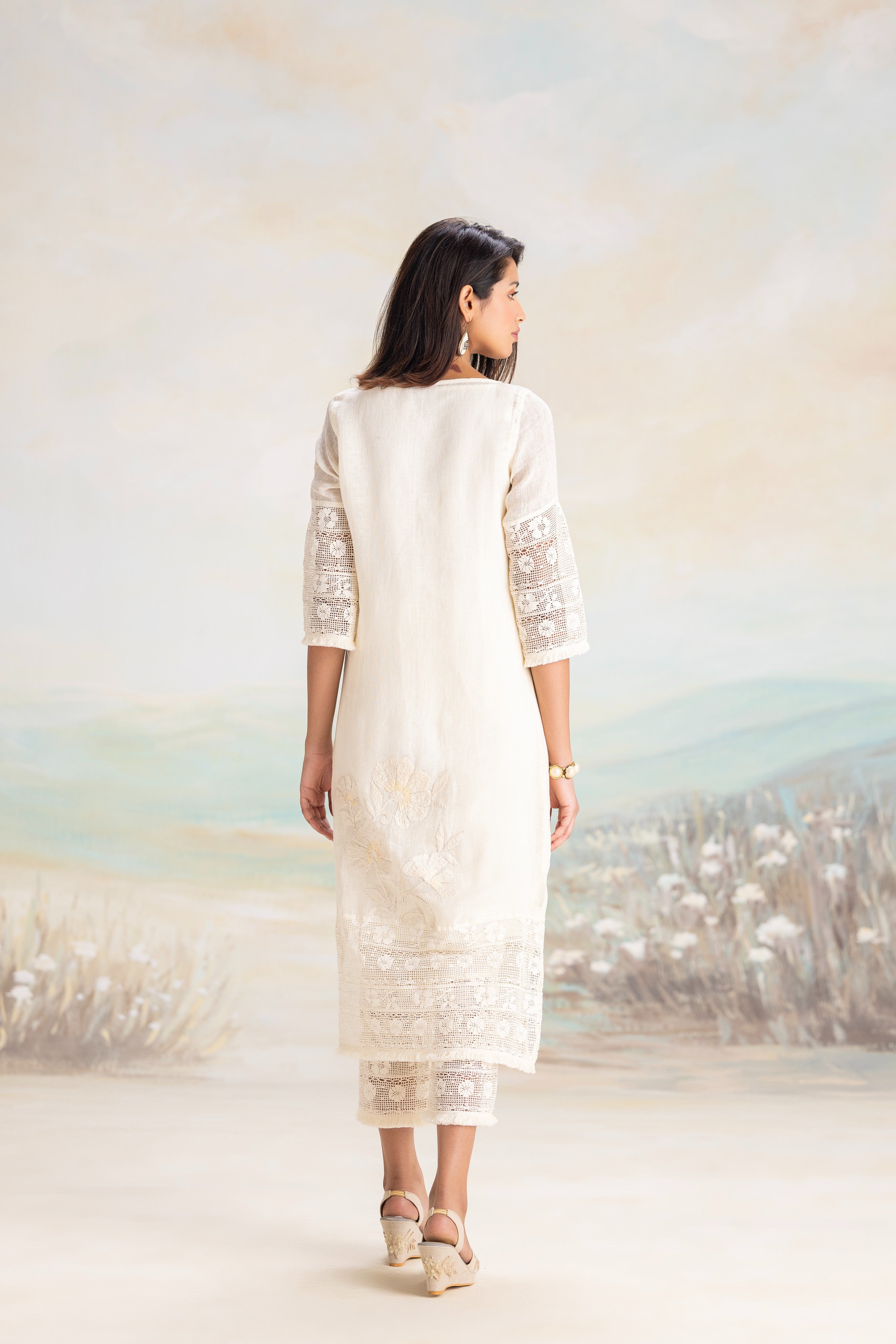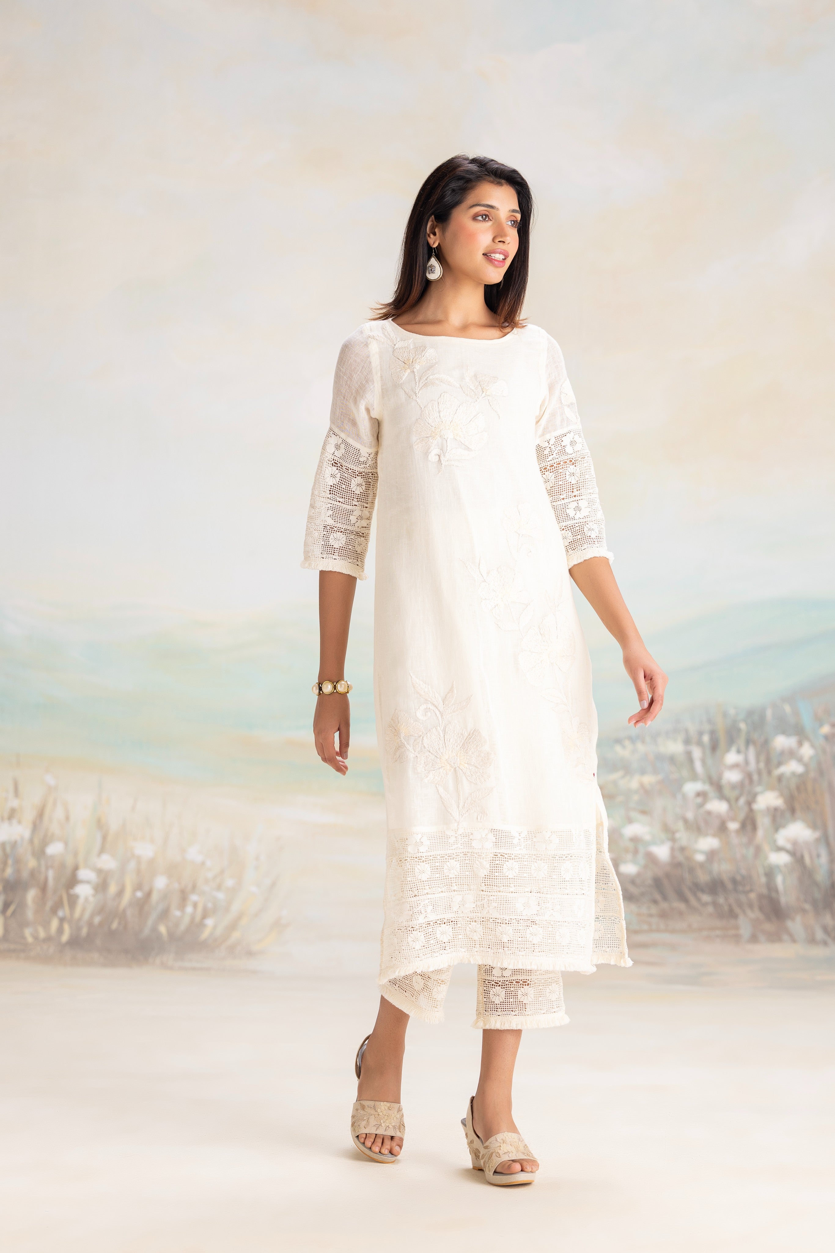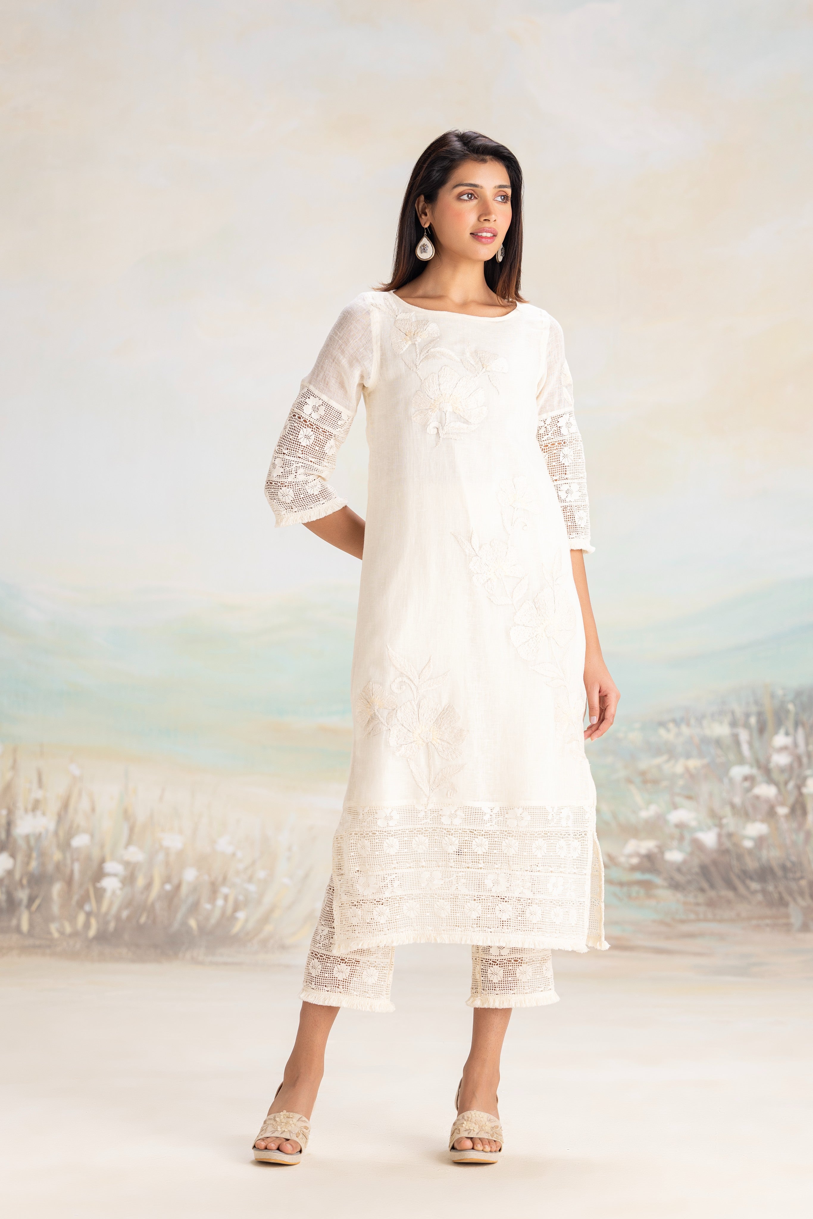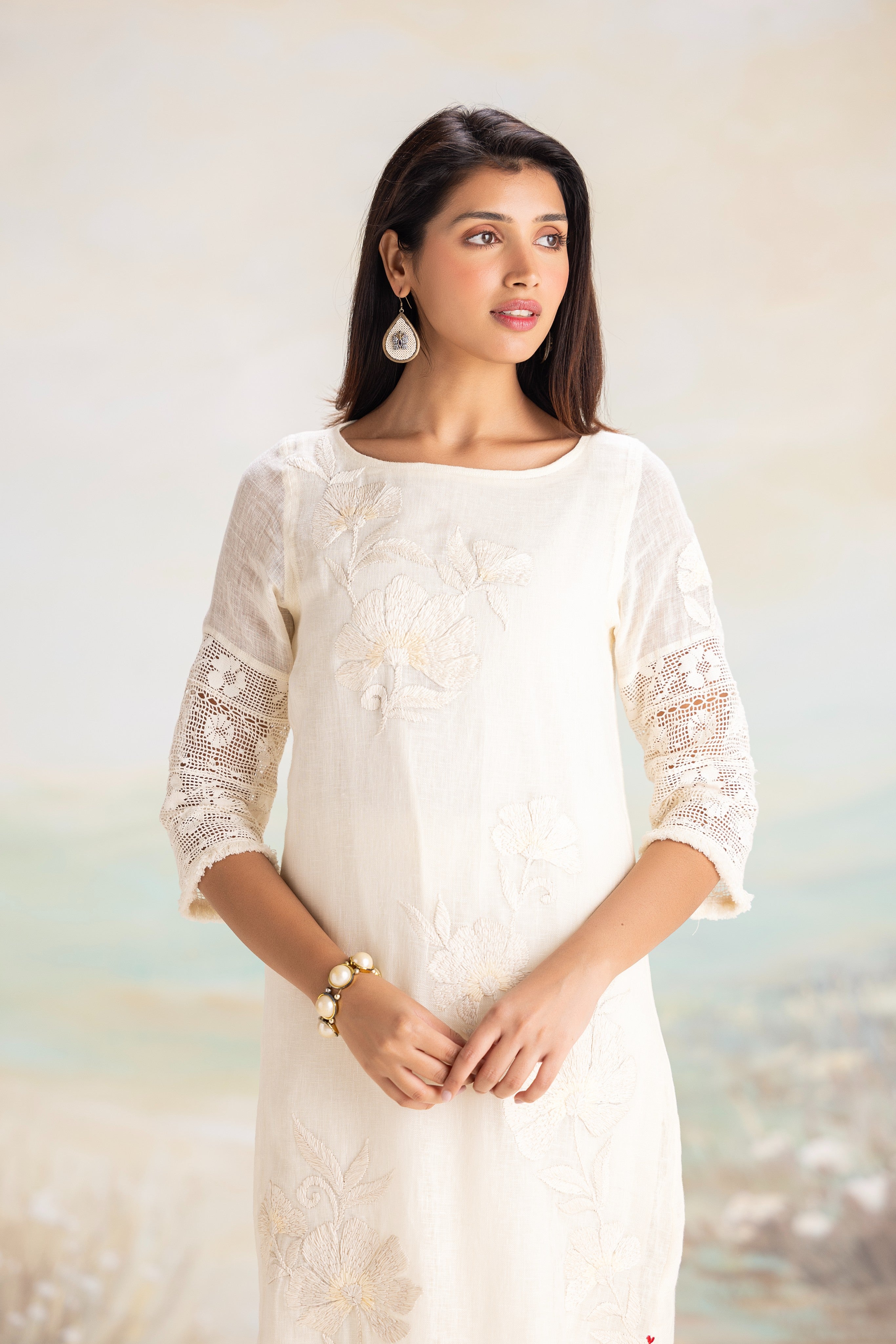 Step into the season with effortless grace in Snow Flower - a stunning collection inspired by the ethereal yet resilient White Crocus. Designed for tranquil moments under the sun for your next getaway, each piece is handcrafted from light weight breathable linen fabric, hand-embroidered with tone-on-tone placement embroidery- pervading seamlessly along the body of the fabric. A stylish testament to exquisite craftsmanship and breezy sophistication.
