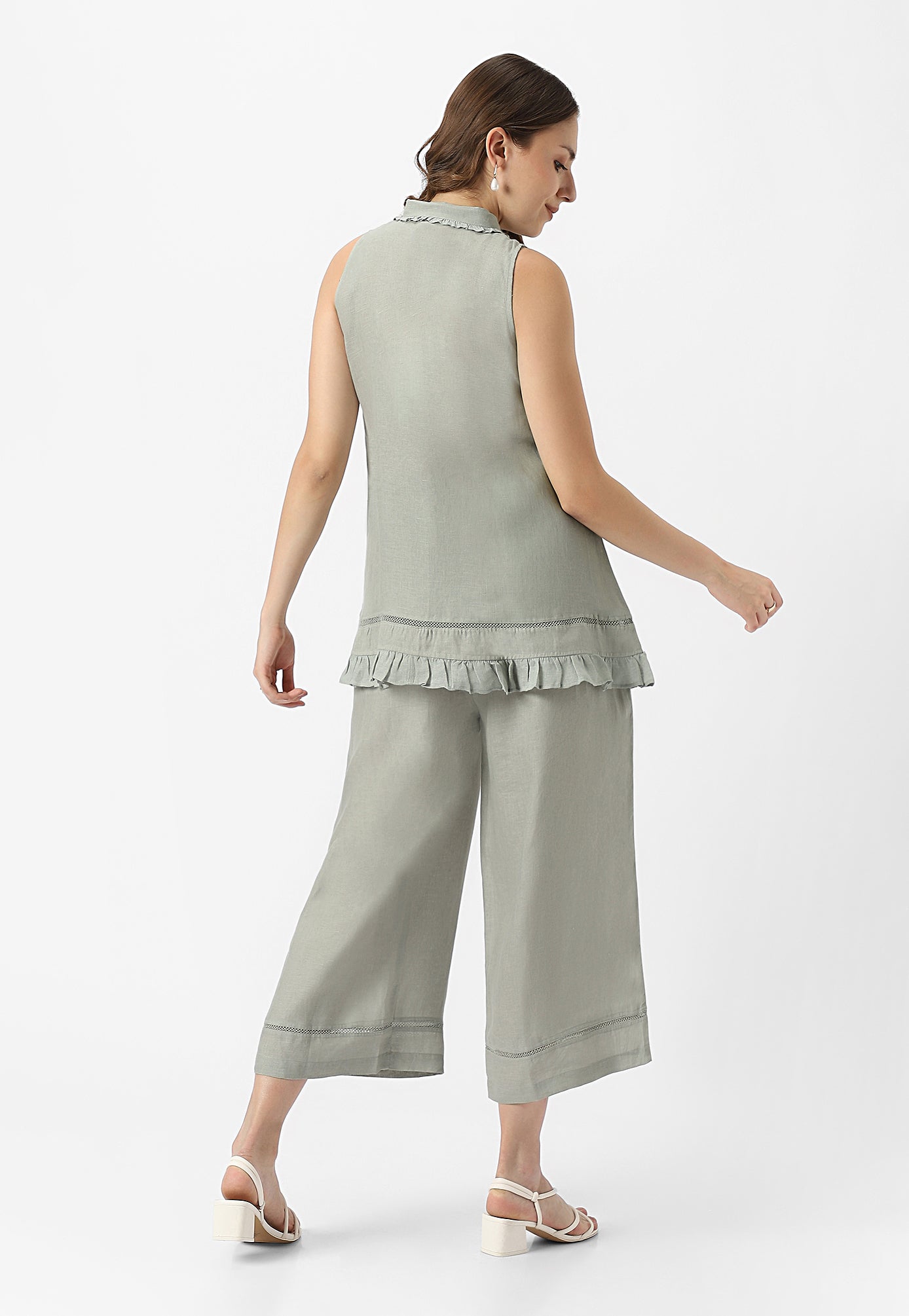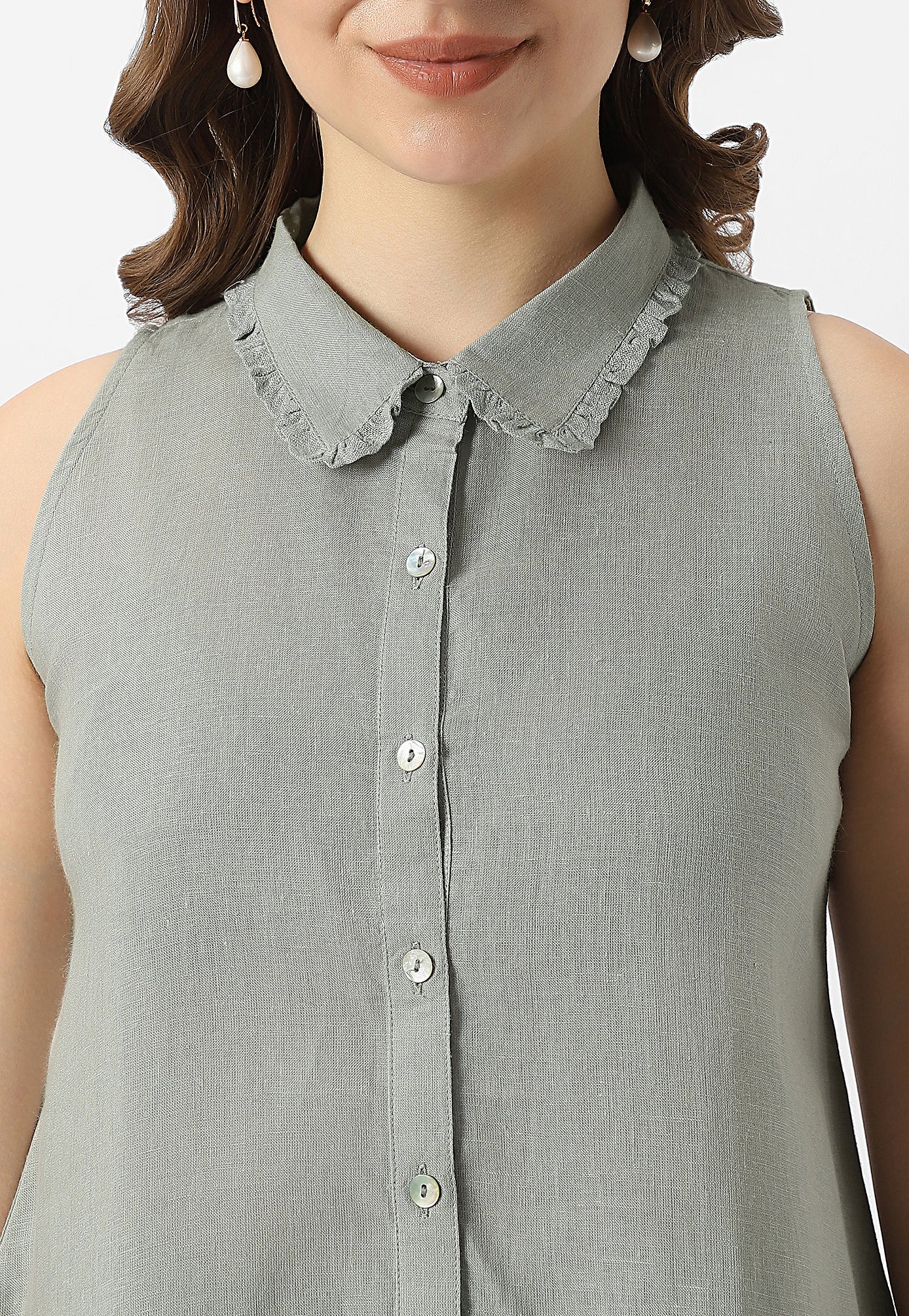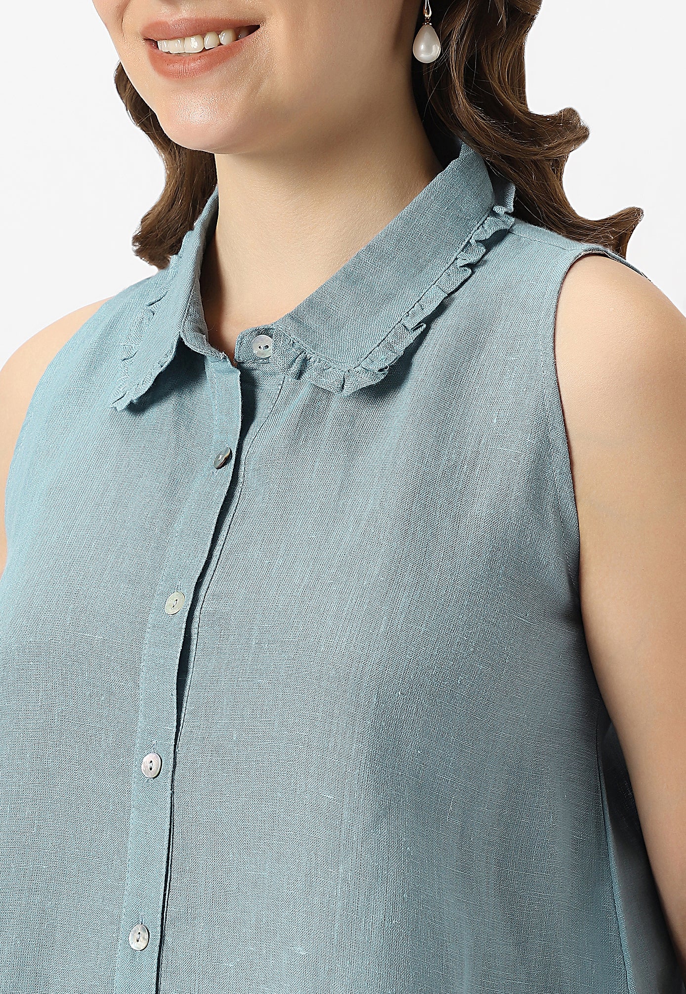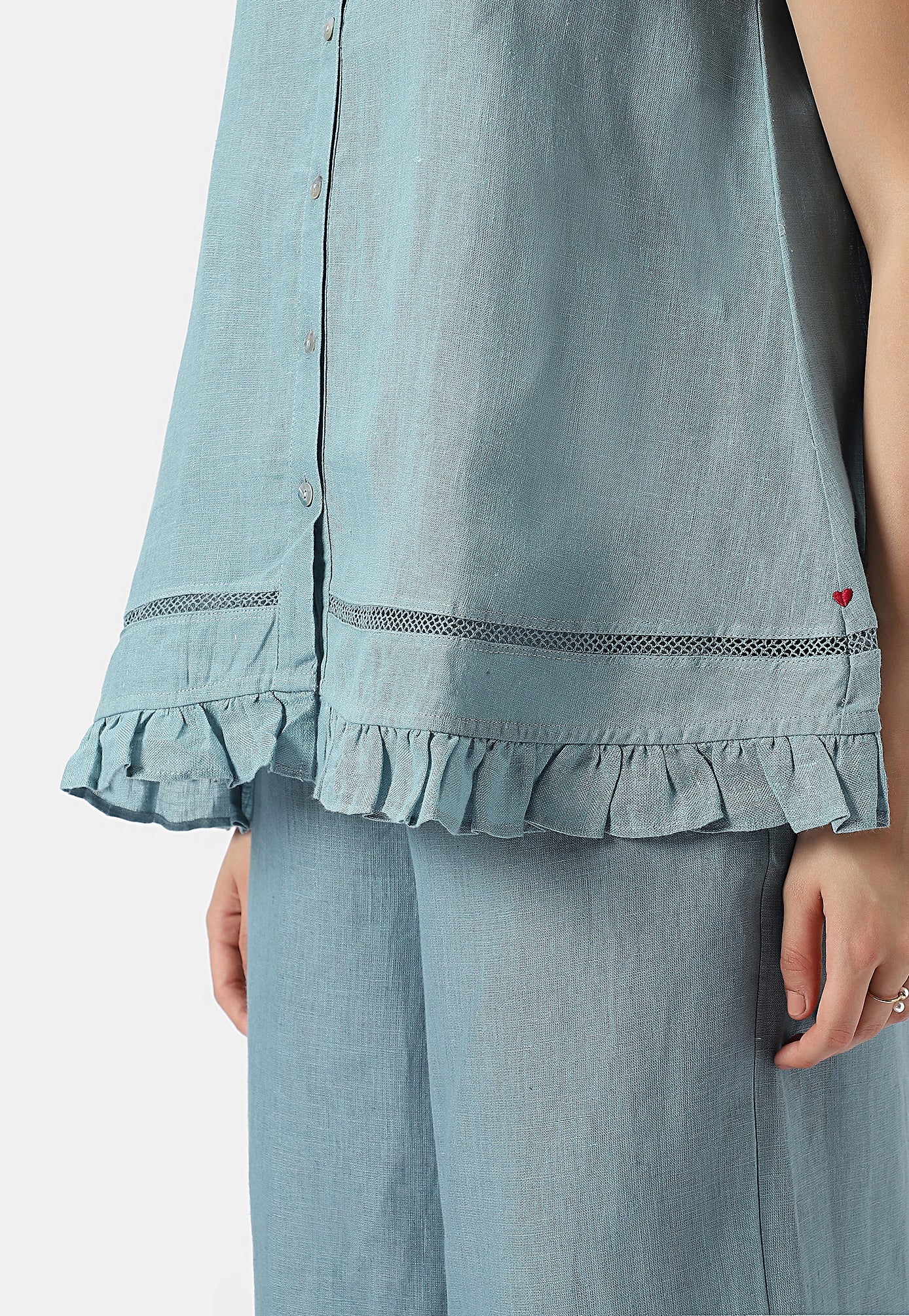 Take on the day in style with a glorious piece from the Teepee range in luxurious linen handcrafted with small ruffled details along the collar, lace delicately interlaced and finely detailed across the sleeve with gathered edges elegantly layered to uplift your style for work or pleasure, any time and anywhere. Available in stunning shades of muskmelon and rain.