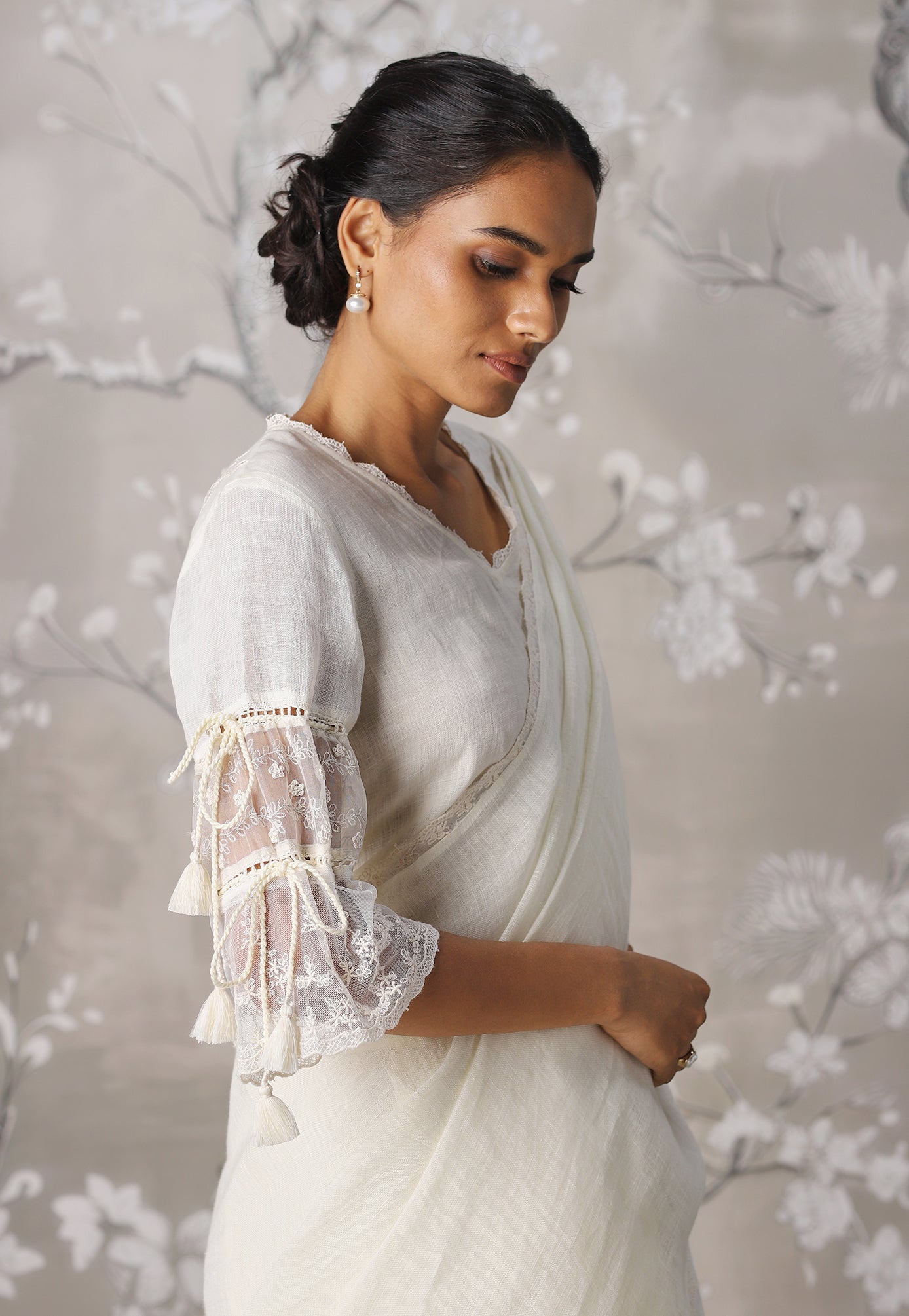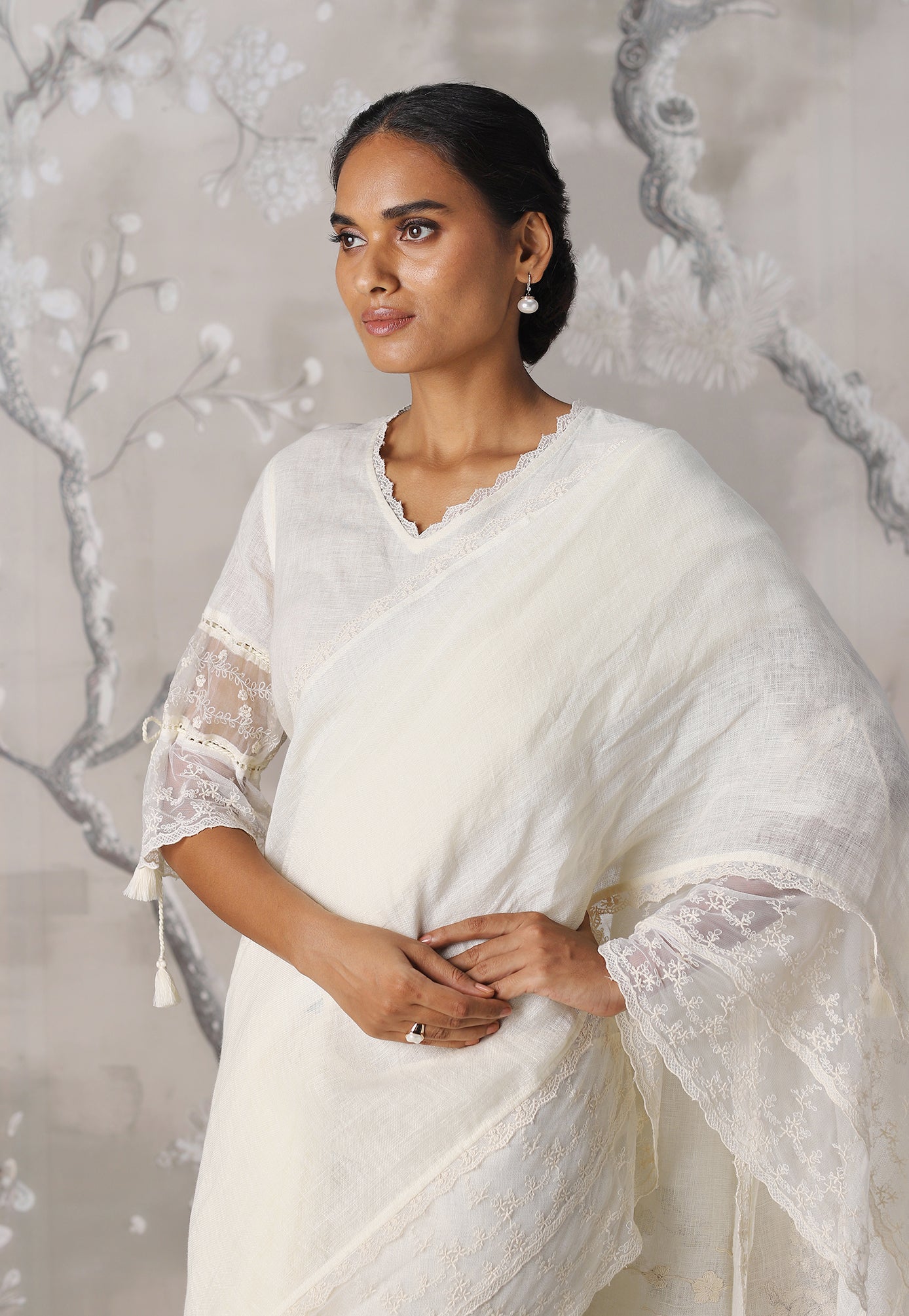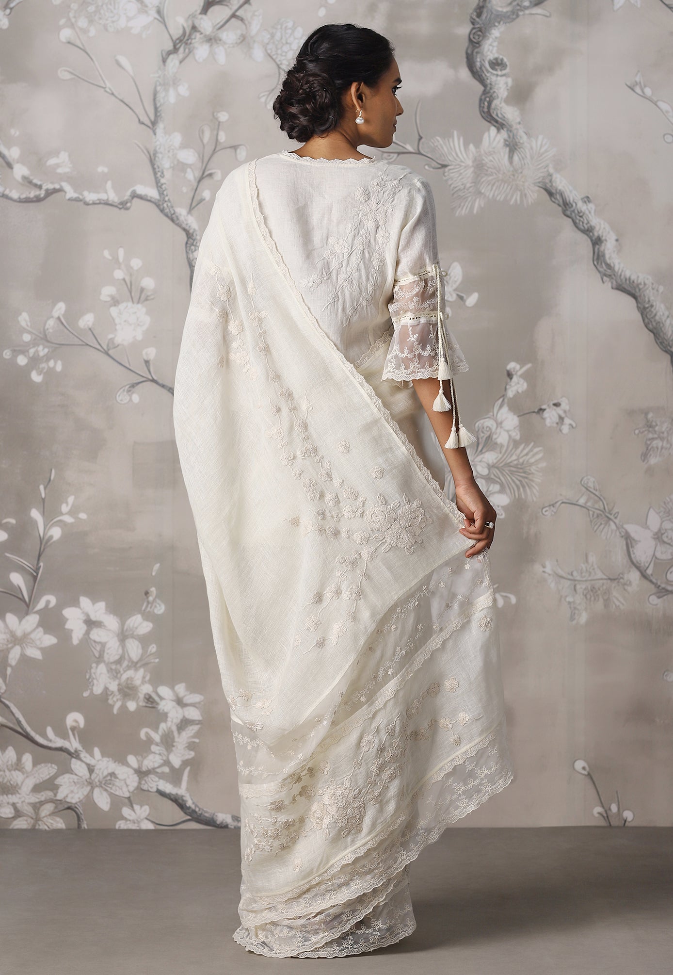 A symphony of blooms, delicately woven in cotton threads, dances across the fabric like a whispered sonnet. Each petal, each vine, a testament to nature's artistry. Layered with ethereal laces, it becomes a canvas of dreams, where beauty intertwines with grace, in a timeless ode to floral elegance.