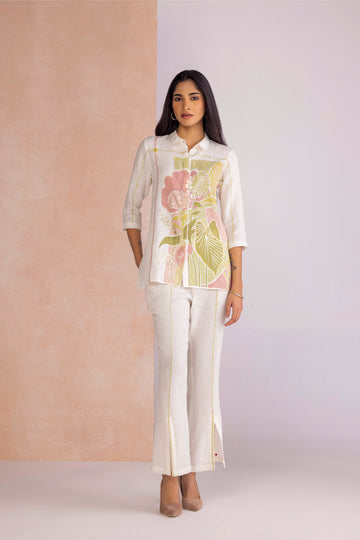 • The Shirt features a relaxed silhouette with 3/4 sleeves, side slits, and contrast overlock detailing, adding a contemporary edge to its clean design. Paired with the Panelled Boot Pant — tailored with structured panels, a flattering boot-leg cut, and overlock finishes accenting its sleek center-front slit — the look is sharp and modern.