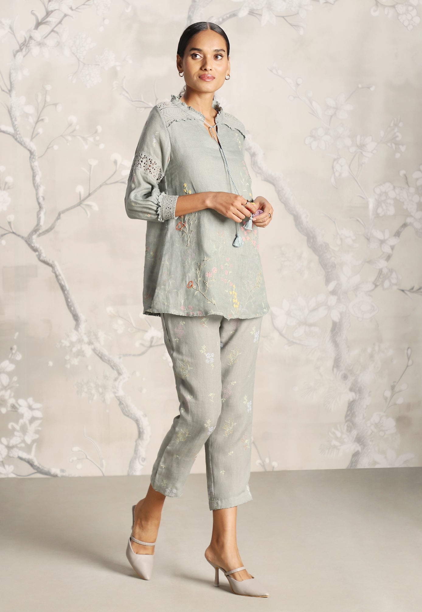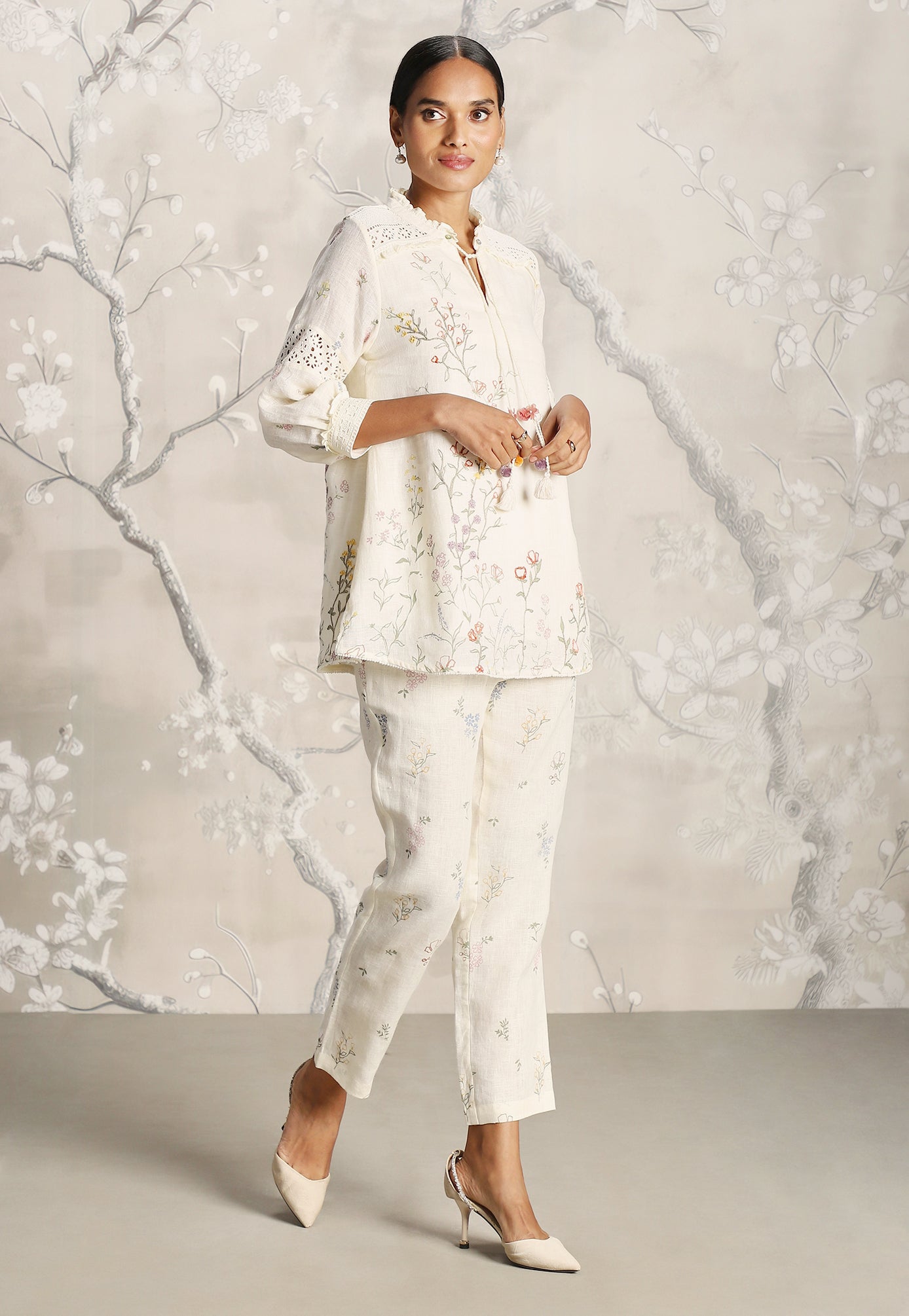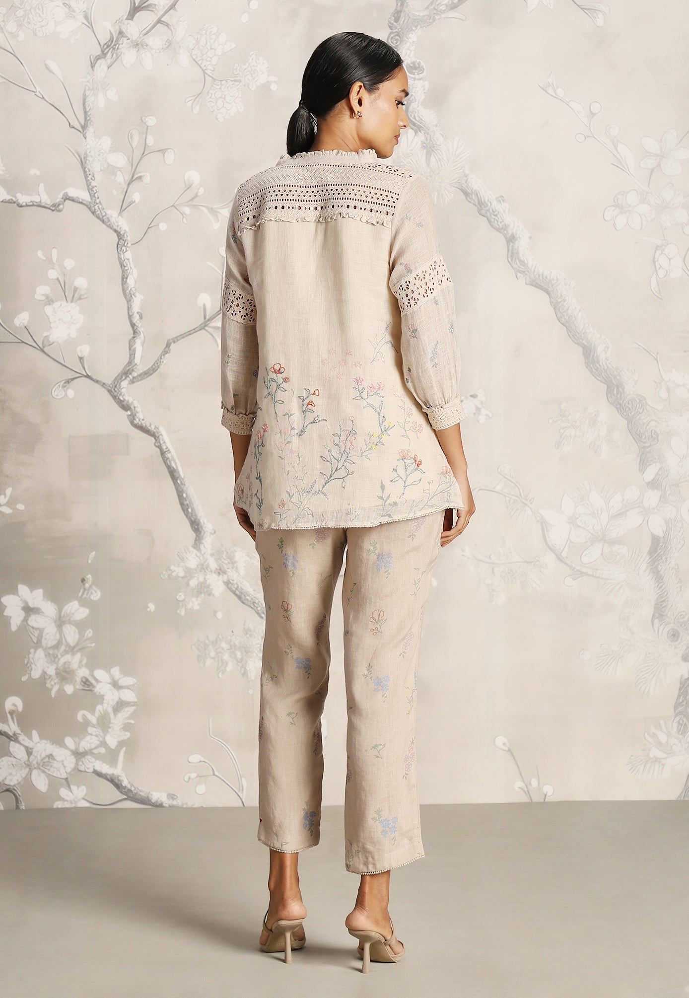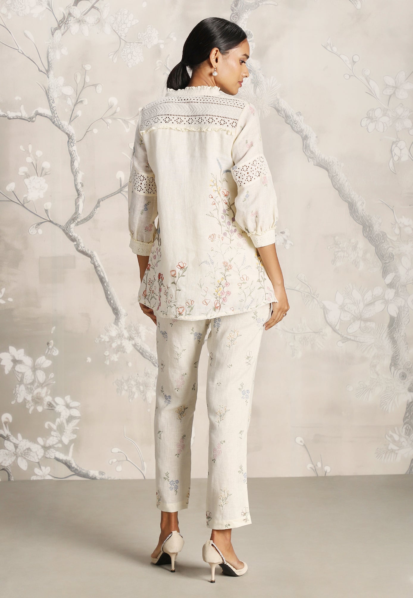 We venture into the forest on luxurious linen and between the denseness we witness exuberant blooms that are hand screen printed; accompanied by the sensuality of delicate Hakuba lace paired with harmonized embroidery to let you commune with mother nature in style.