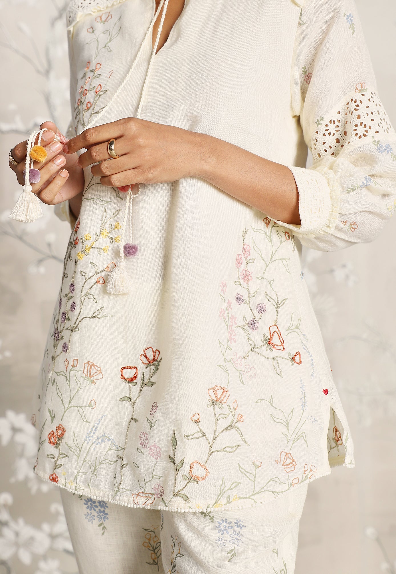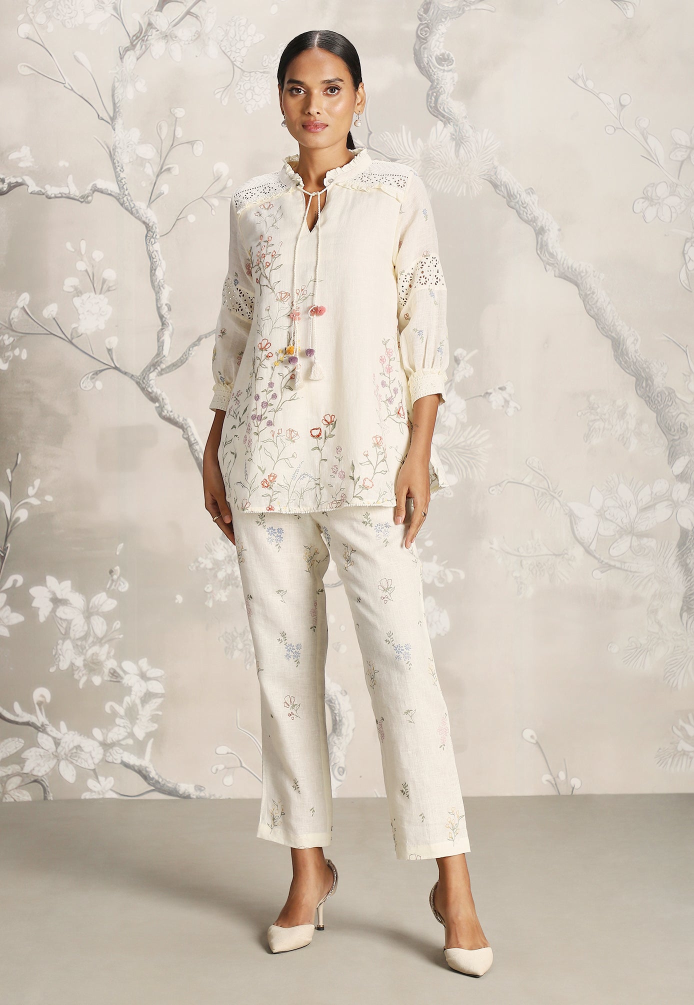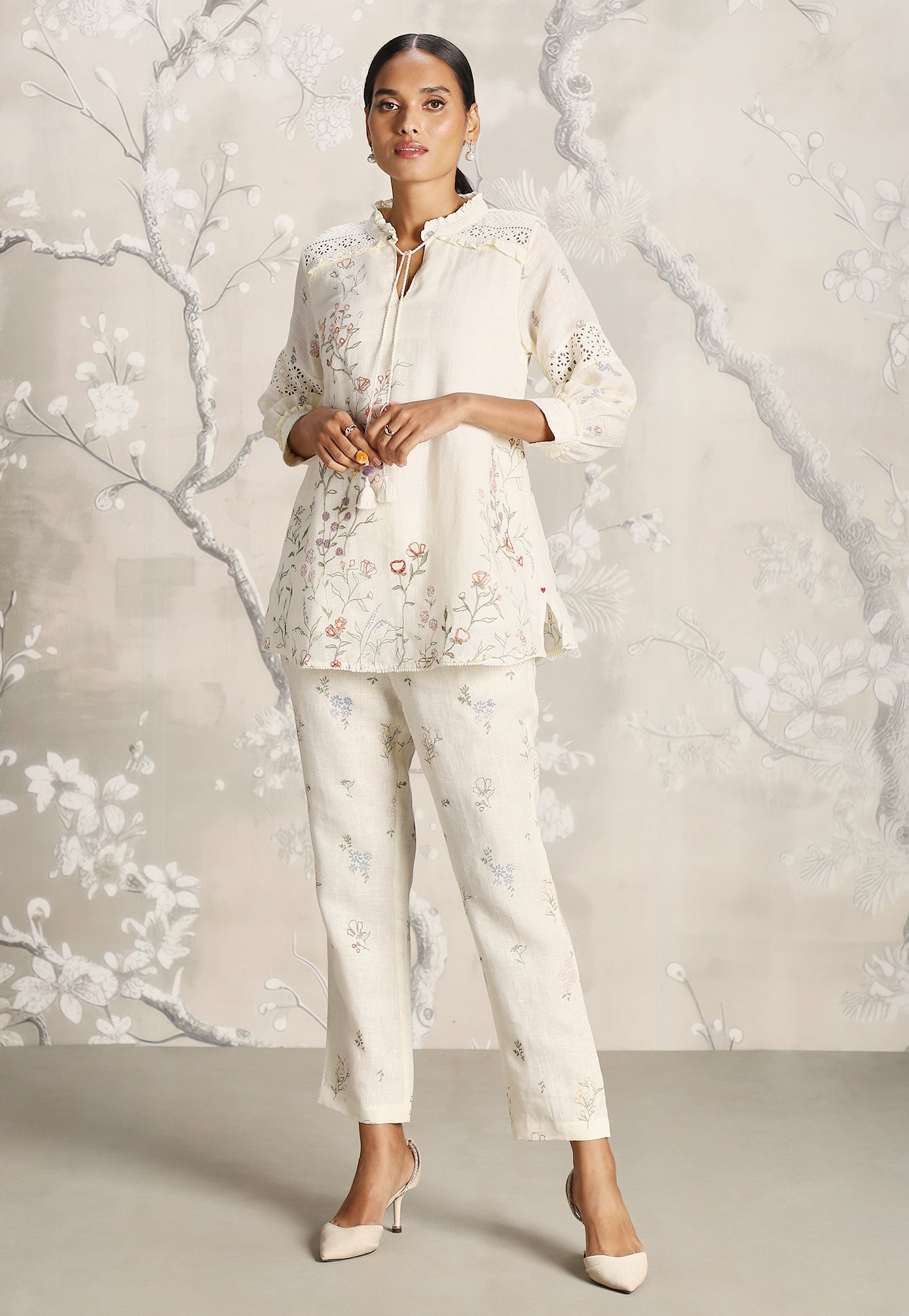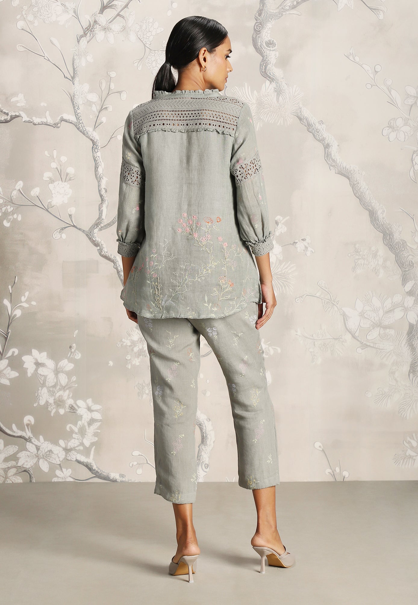 We venture into the forest on luxurious linen and between the denseness we witness exuberant blooms that are hand screen printed; accompanied by the sensuality of delicate Hakuba lace paired with harmonized embroidery to let you commune with mother nature in style.
