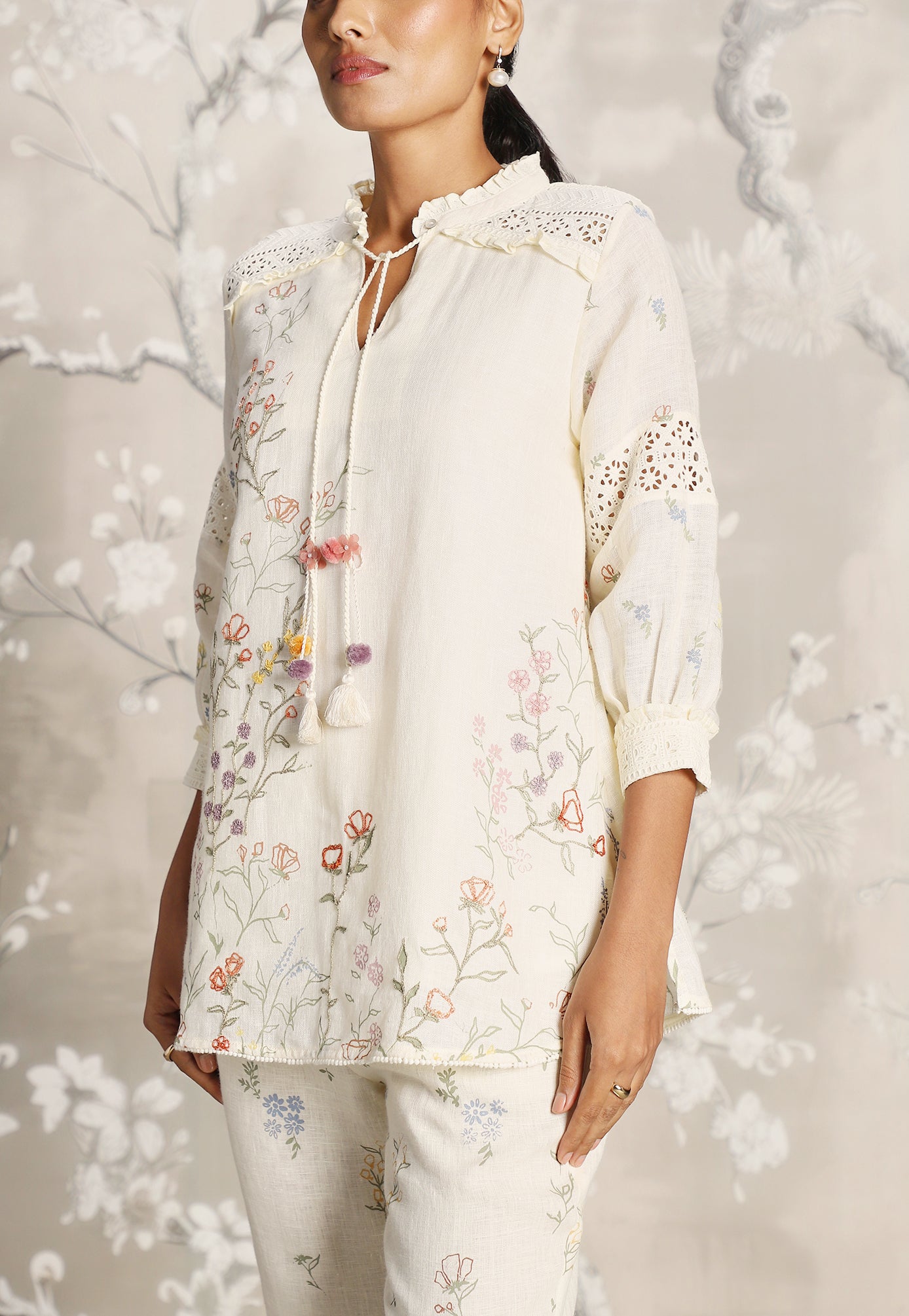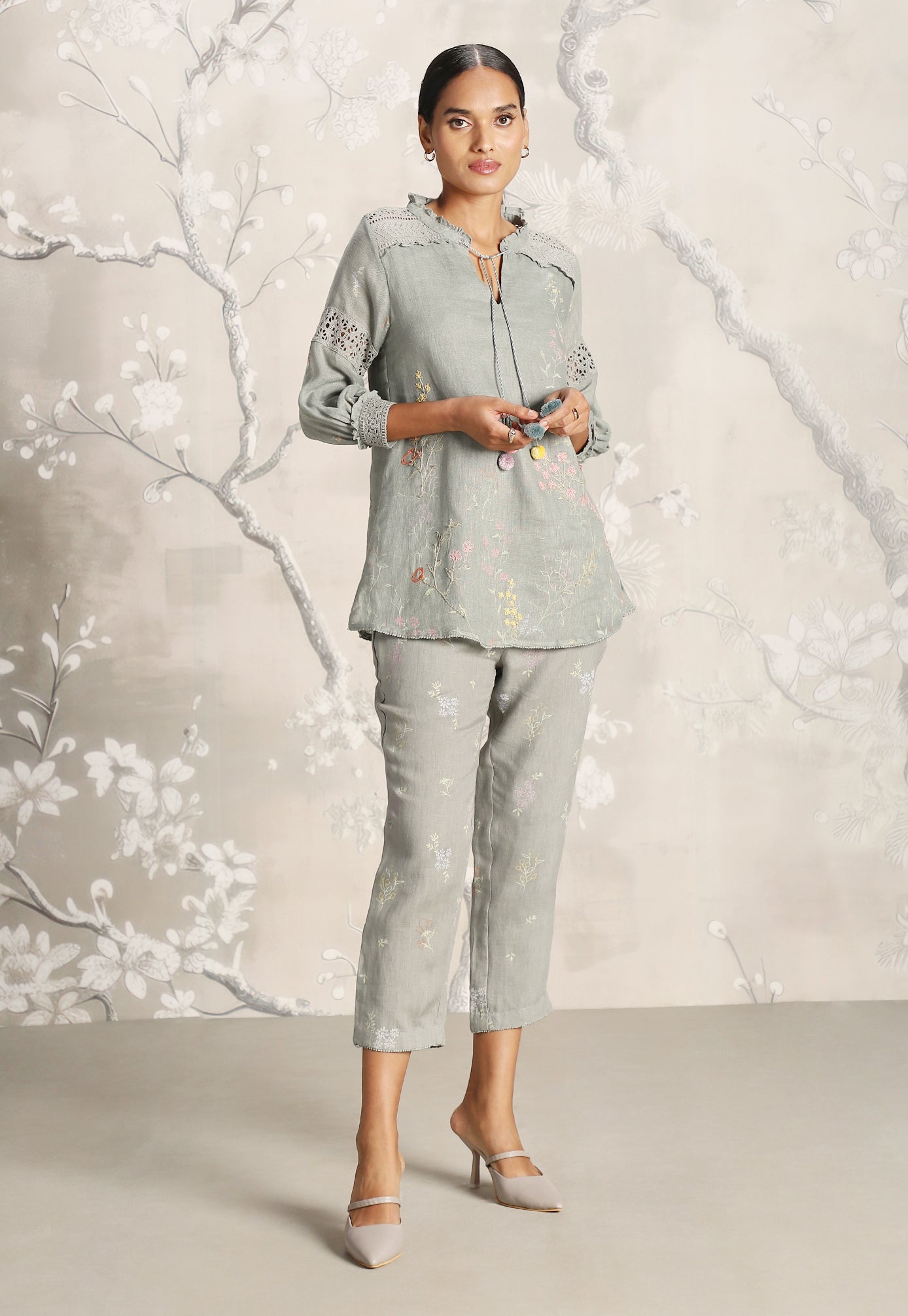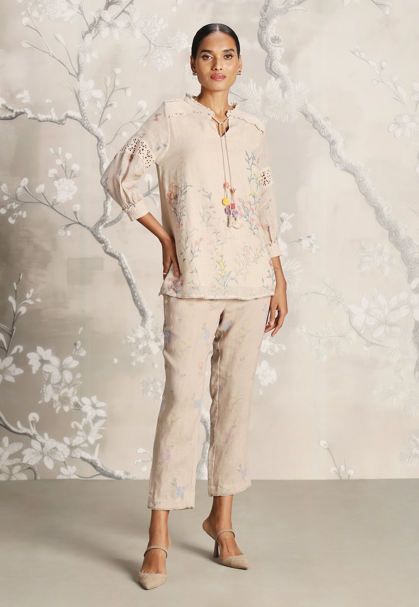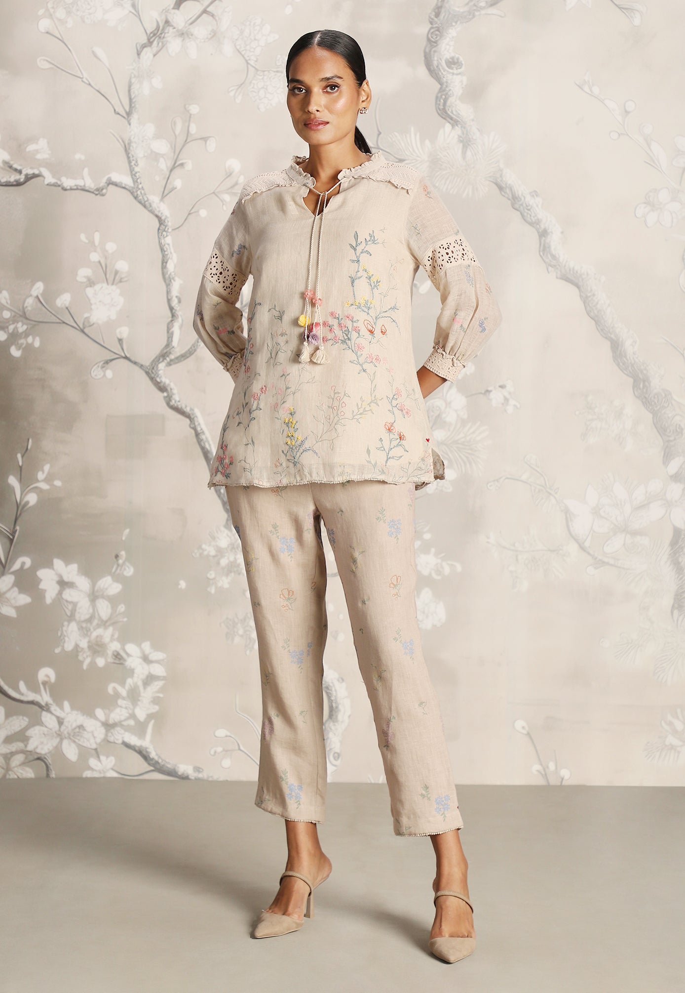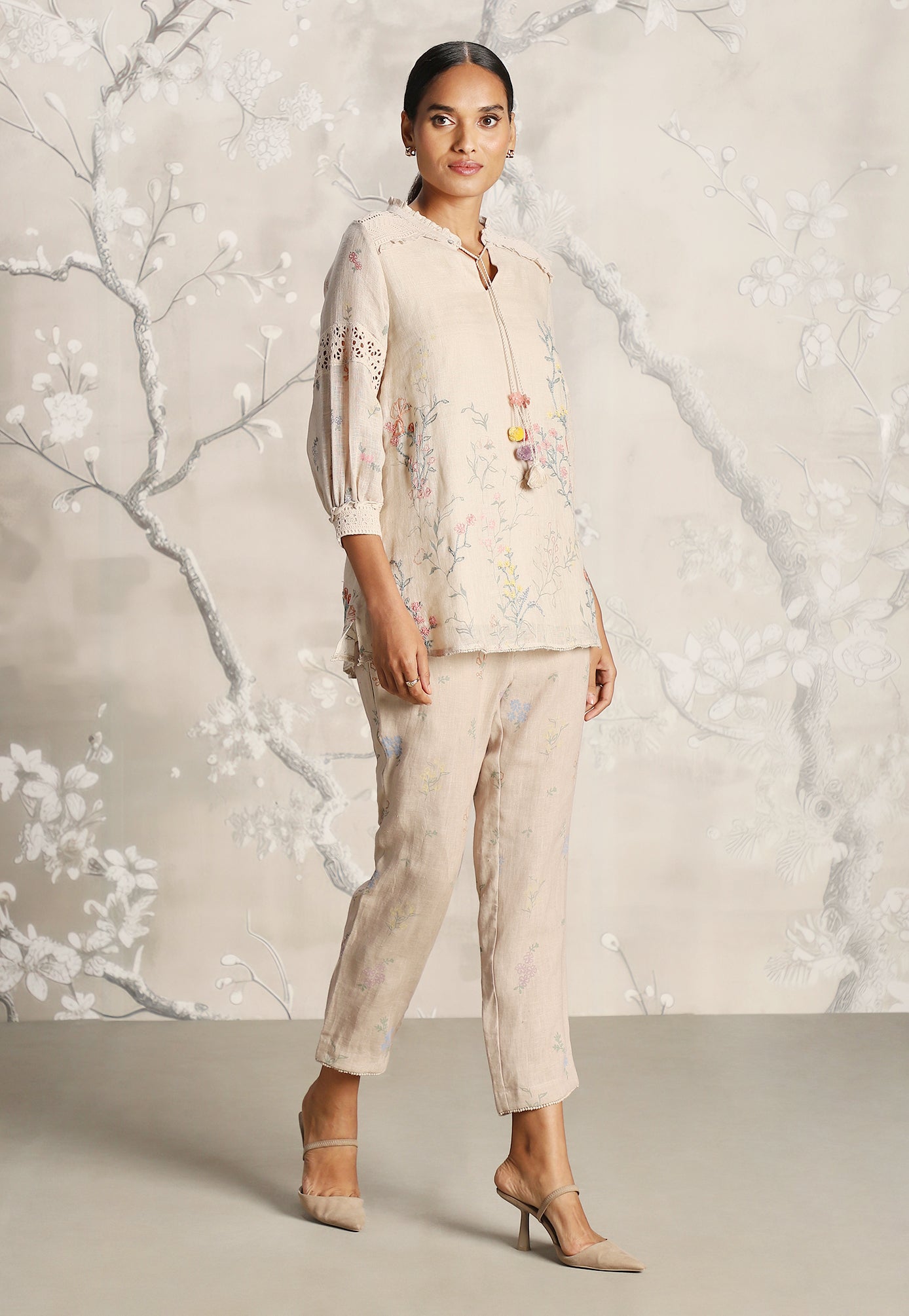 We venture into the forest on luxurious linen and between the denseness we witness exuberant blooms that are hand screen printed; accompanied by the sensuality of delicate Hakuba lace paired with harmonized embroidery to let you commune with mother nature in style.