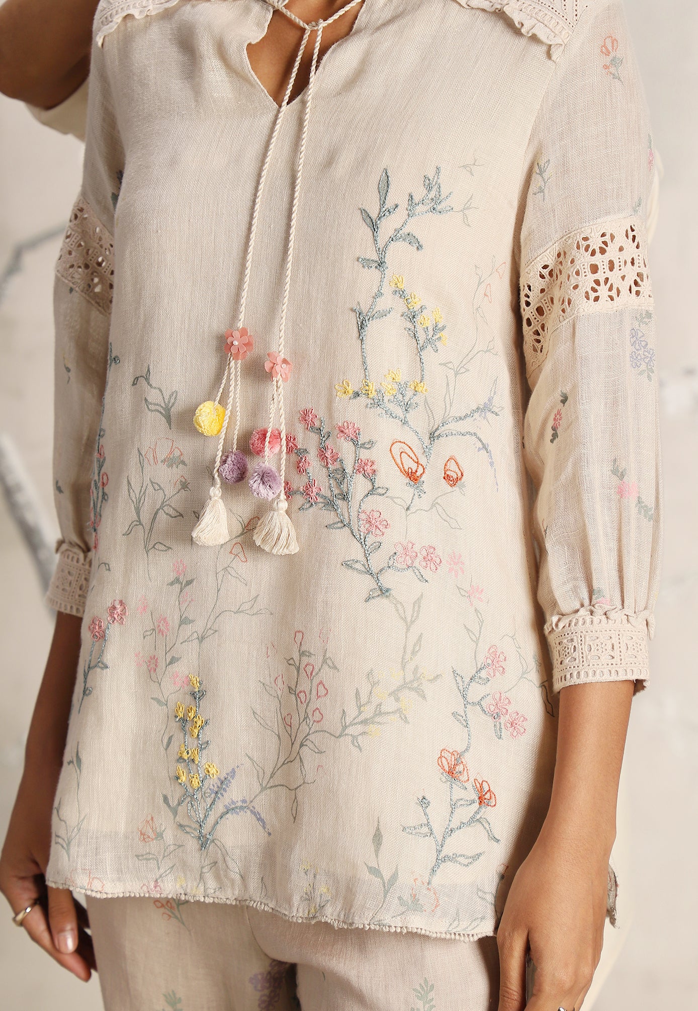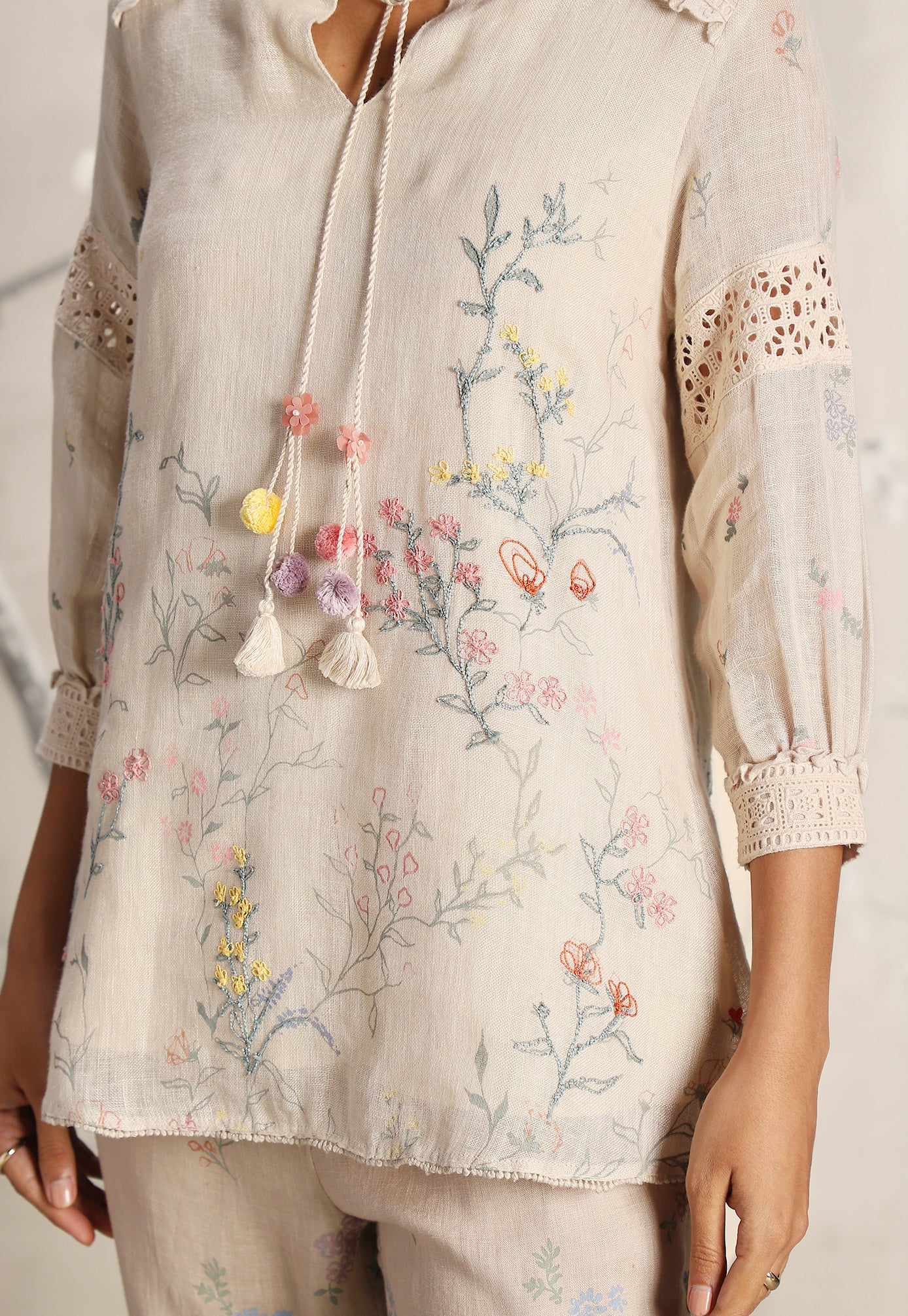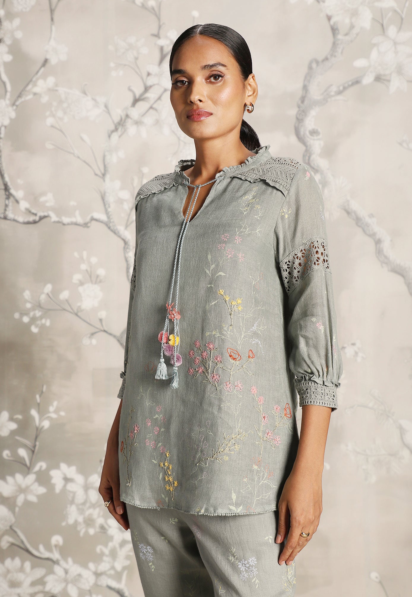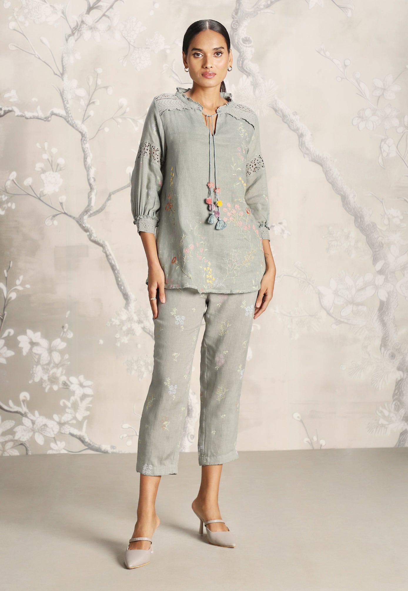 We venture into the forest on luxurious linen and between the denseness we witness exuberant blooms that are hand screen printed; accompanied by the sensuality of delicate Hakuba lace paired with harmonized embroidery to let you commune with mother nature in style.