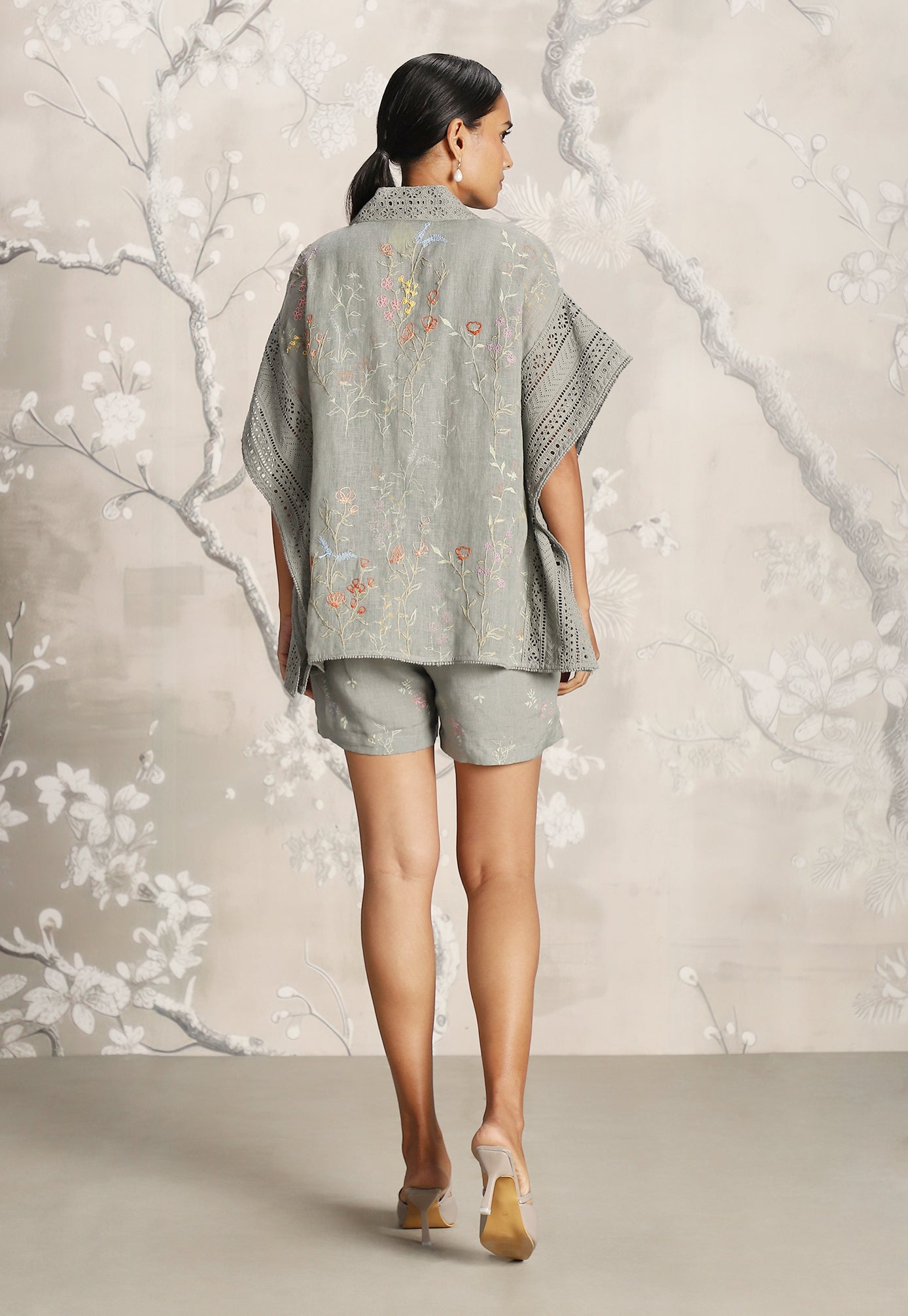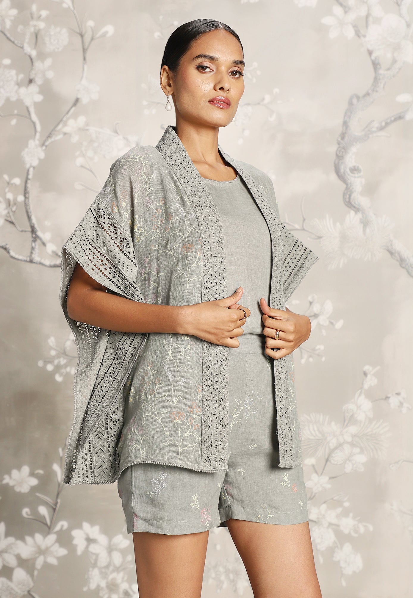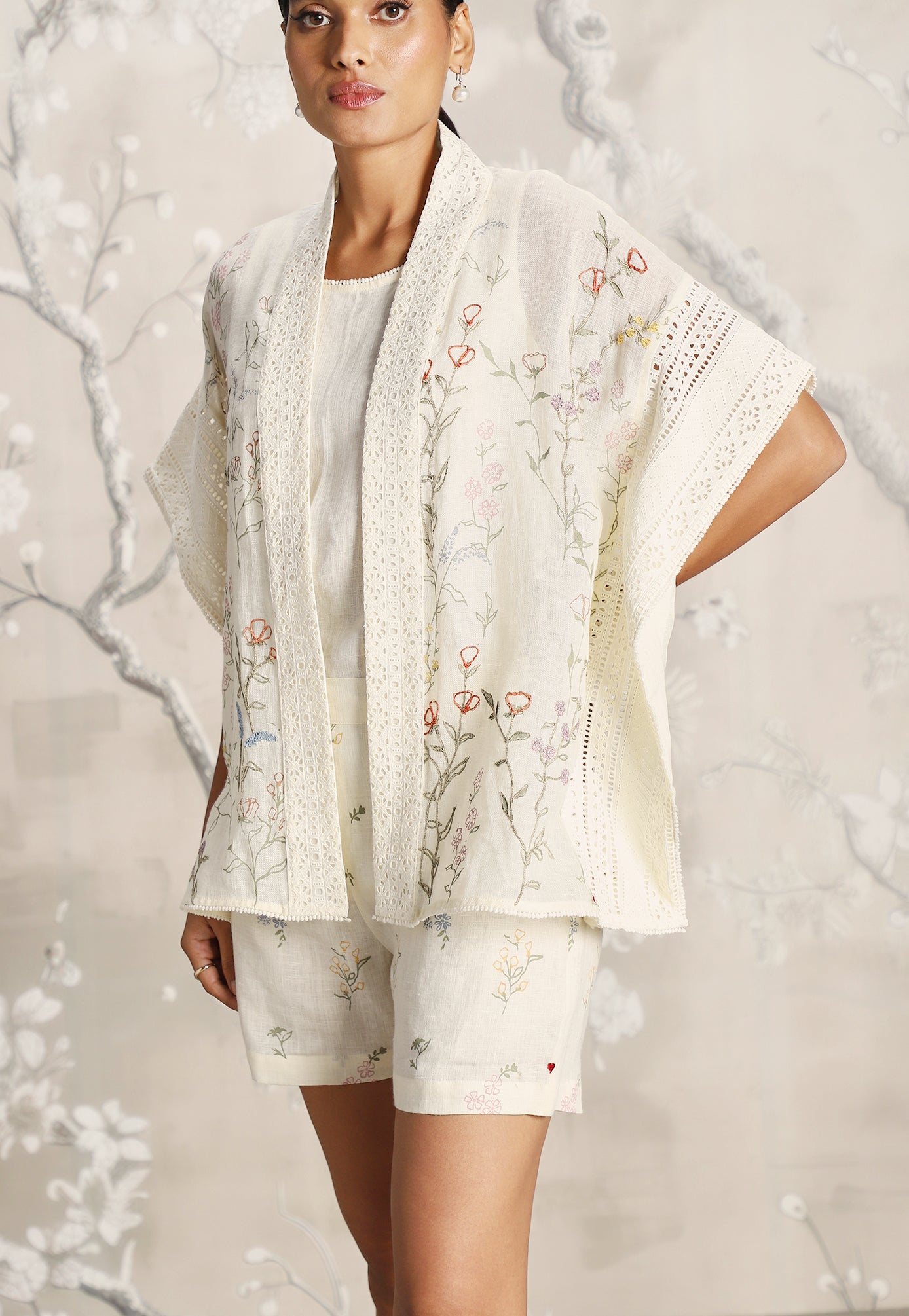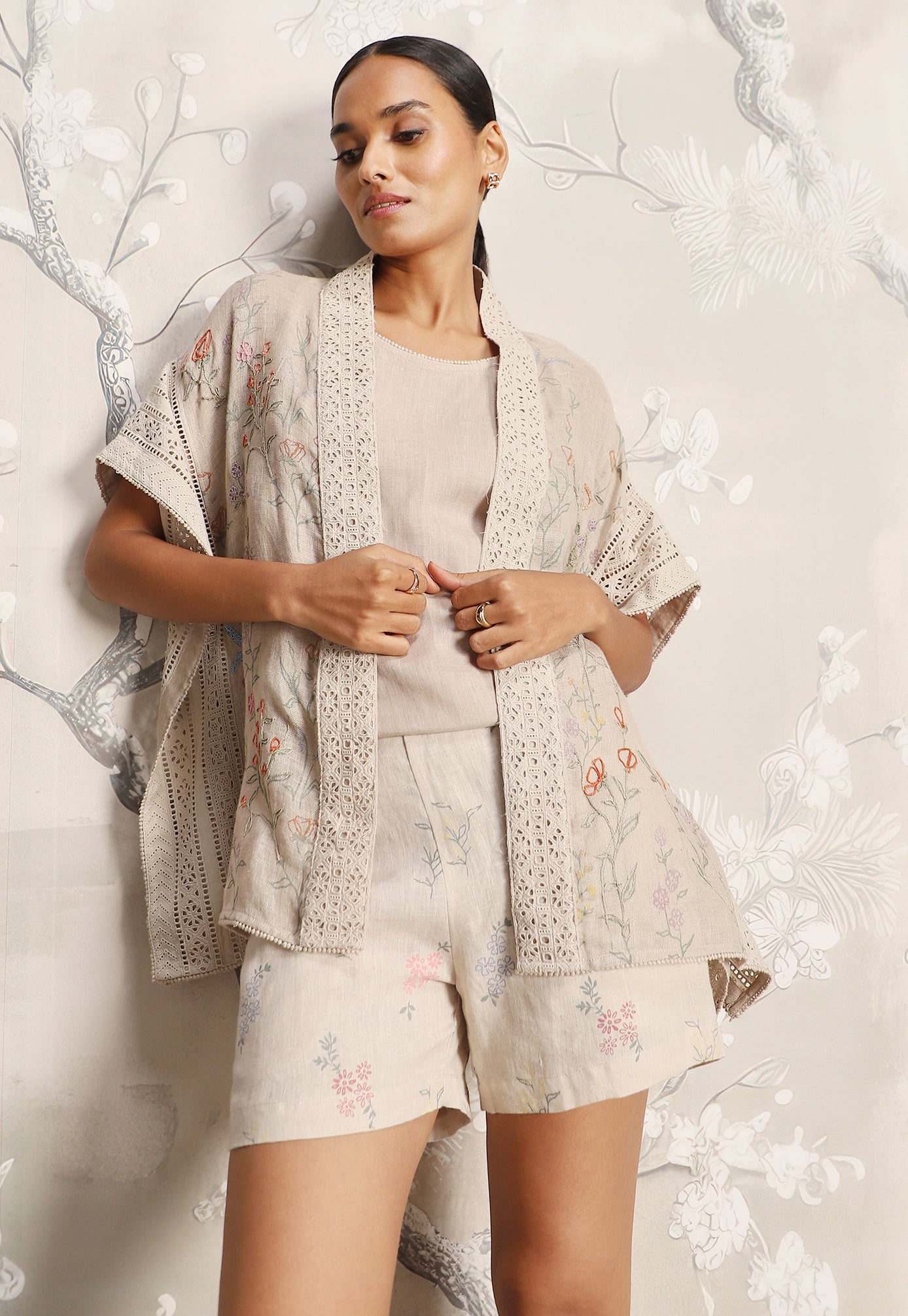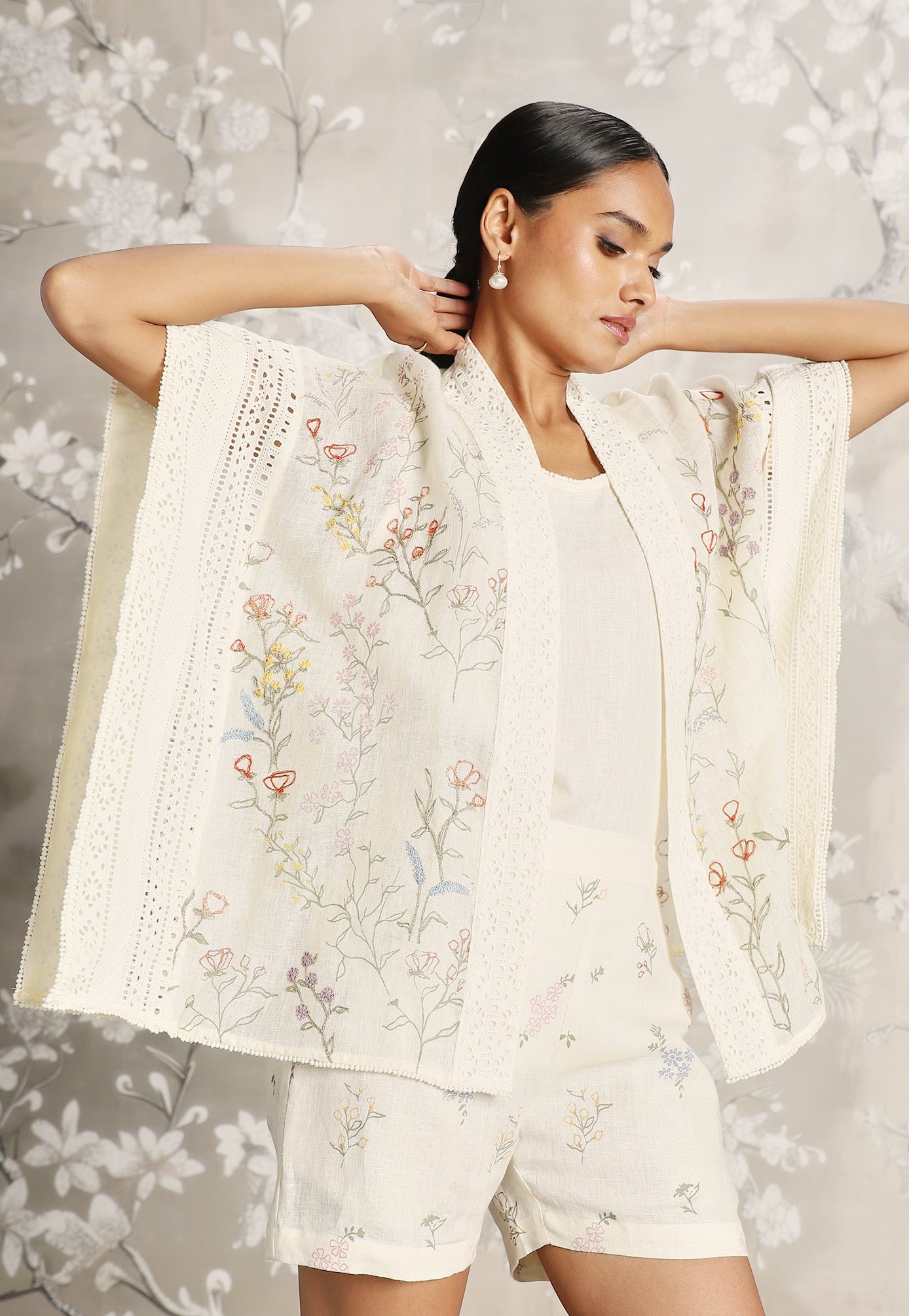 We venture into the forest on luxurious linen and between the denseness we witness exuberant blooms that are hand screen printed; accompanied by the sensuality of delicate Hakoba lace paired with harmonized embroidery to let you commune with mother nature in style.