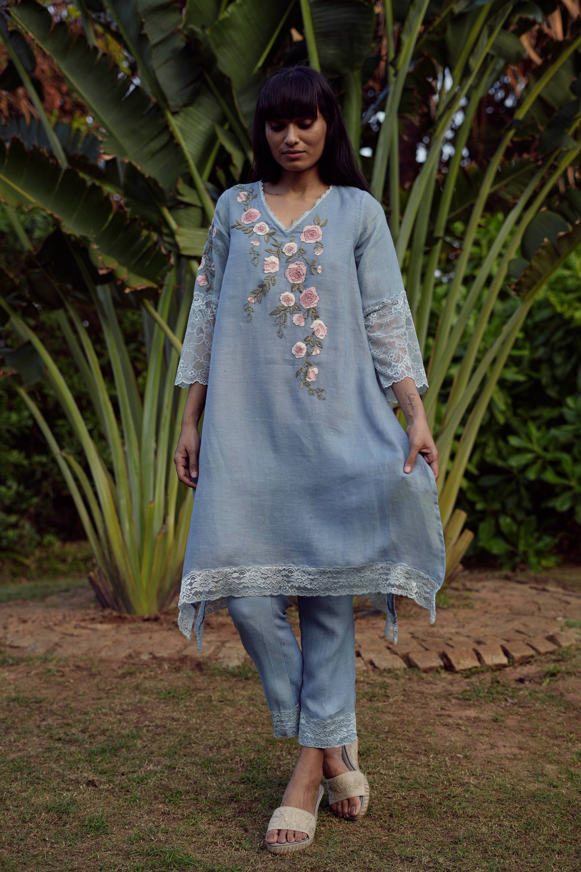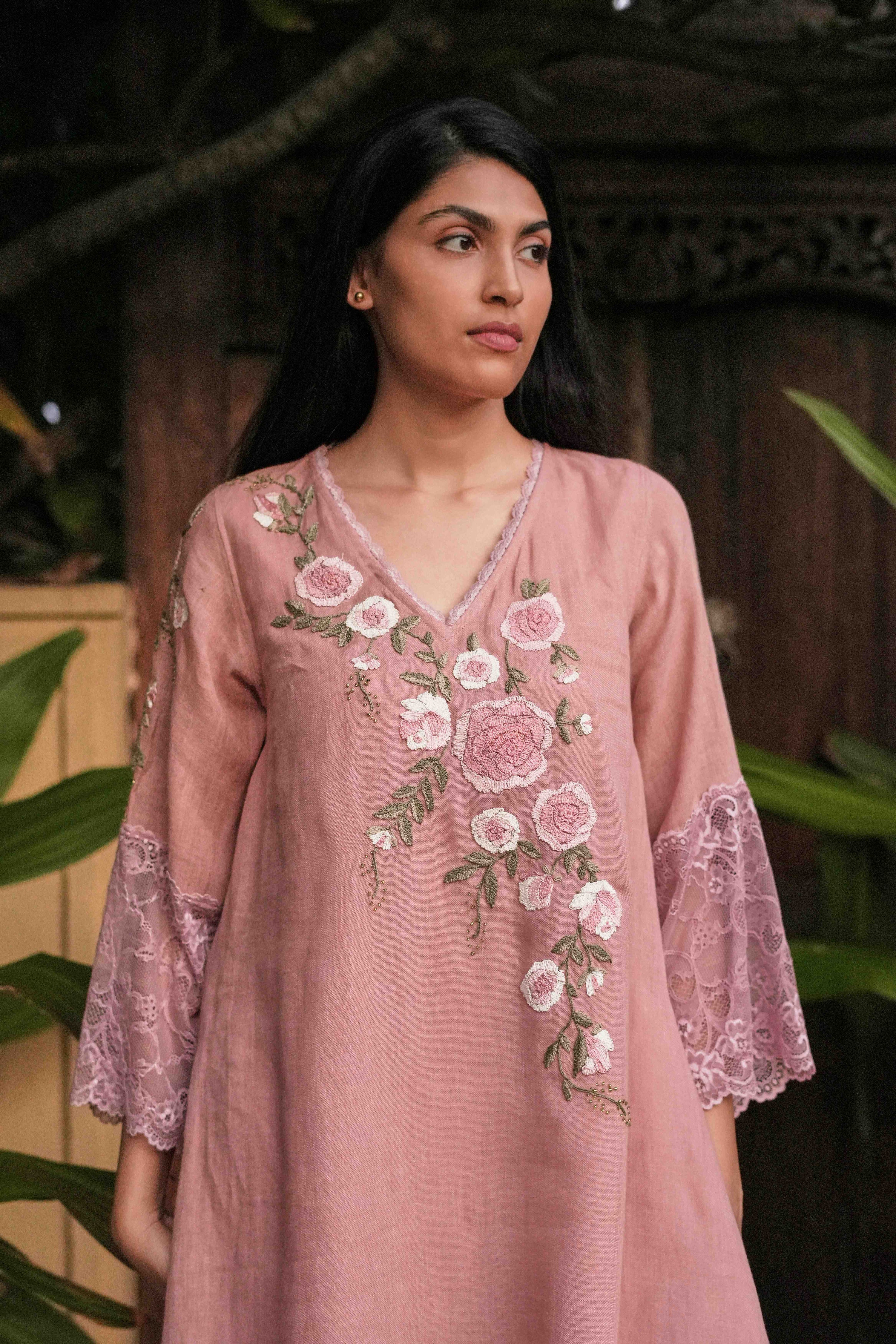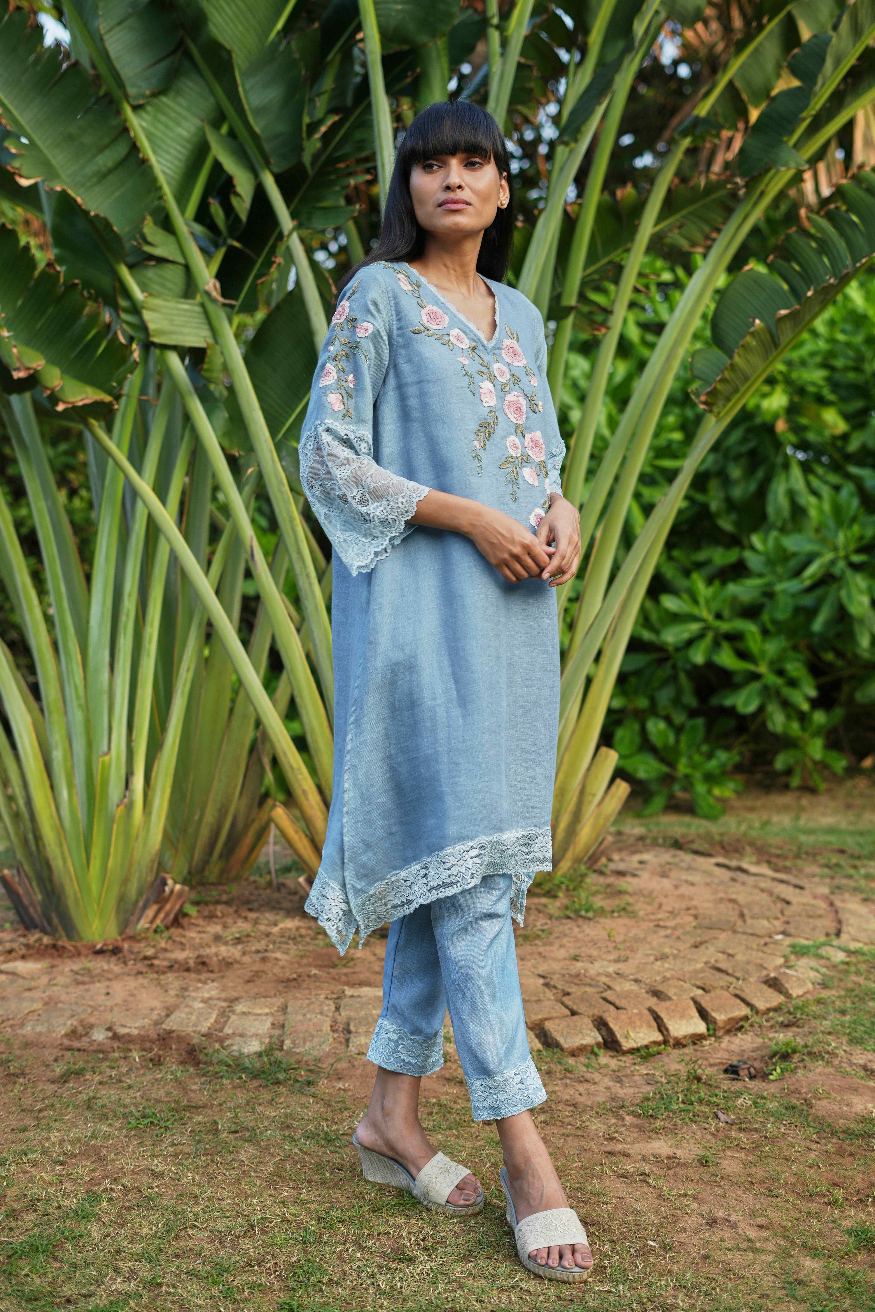 Whimsical Garden is a dreamy escape into a world where art and nature bloom together. Abstract tie-dyed fabrics create a soft, painterly canvas — like skies brushed with colour at golden hour — in two enchanting hues: the tender warmth of Rose Bud and the serene depth of Inkblot. Intricate laces trail across each silhouette like delicate vines, while florals bloom in exquisite embroidery, evoking the romance of a secret garden in full flourish. Sugar beads shimmer like drops of morning dew, lending a luminous texture that dances with light and movement. The neckline is beautifully enhanced with ornate embroidery and finished with charming floral tassels that sway gracefully at the neck and sleeves. Romantic, ethereal, and irresistibly elegant, Whimsical Garden invites you to step into a story where every detail blossoms with beauty.