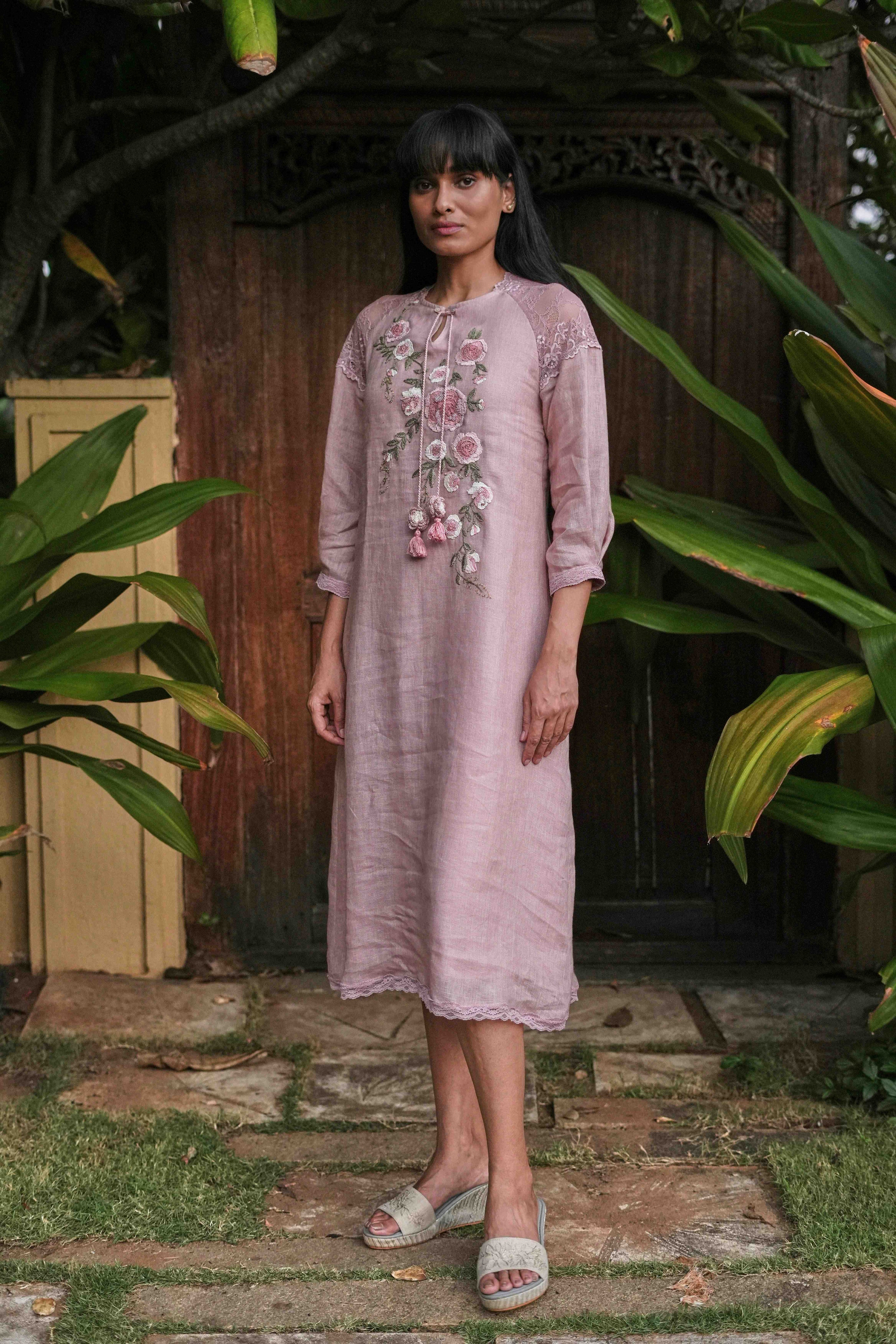 Whimsical Garden is a dreamy escape into a world where art and nature bloom together. Abstract tie-dyed fabrics create a soft, painterly canvas — like skies brushed with colour at golden hour — in two enchanting hues: the tender warmth of Rose Bud and the serene depth of Inkblot. Intricate laces trail across each silhouette like delicate vines, while florals bloom in exquisite embroidery, evoking the romance of a secret garden in full flourish. Sugar beads shimmer like drops of morning dew, lending a luminous texture that dances with light and movement. The neckline is beautifully enhanced with ornate embroidery and finished with charming floral tassels that sway gracefully at the neck and sleeves. Romantic, ethereal, and irresistibly elegant, Whimsical Garden invites you to step into a story where every detail blossoms with beauty.